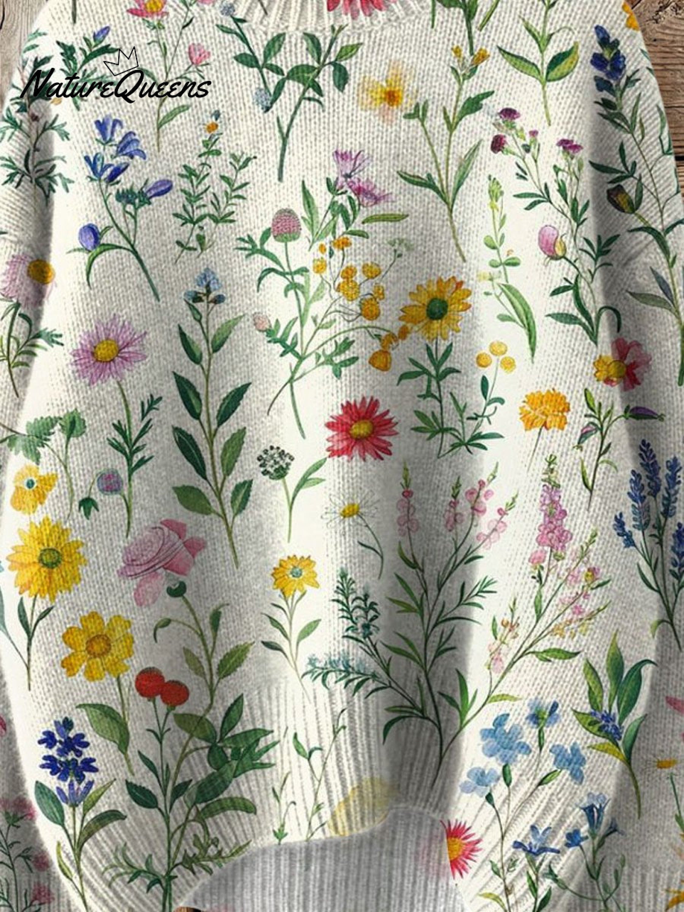 Lovely Floral Art Print Knit Turtleneck Pullover Sweater