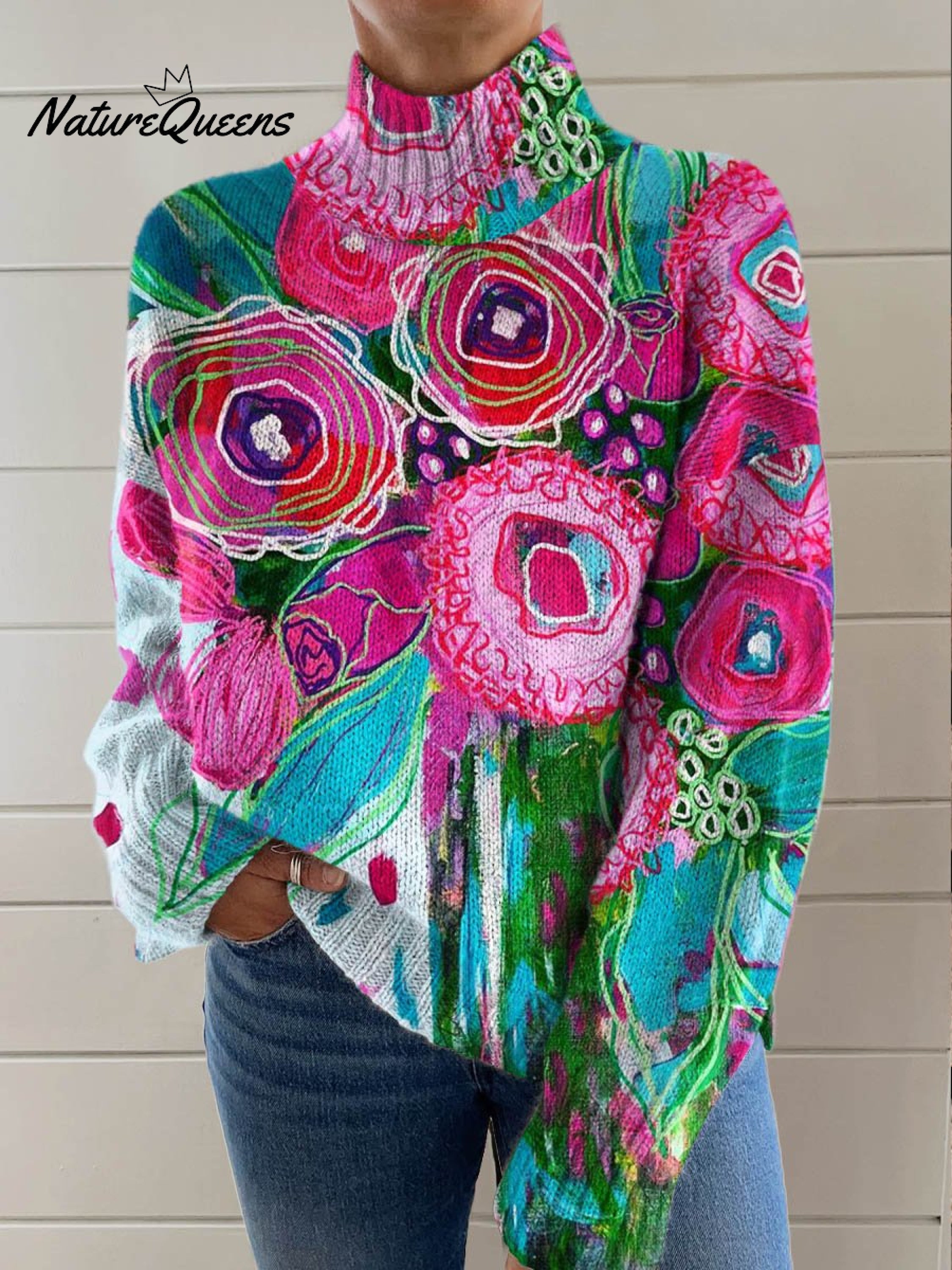 Lovely Floral Pattern Art Print Knit Turtleneck Pullover Sweater