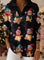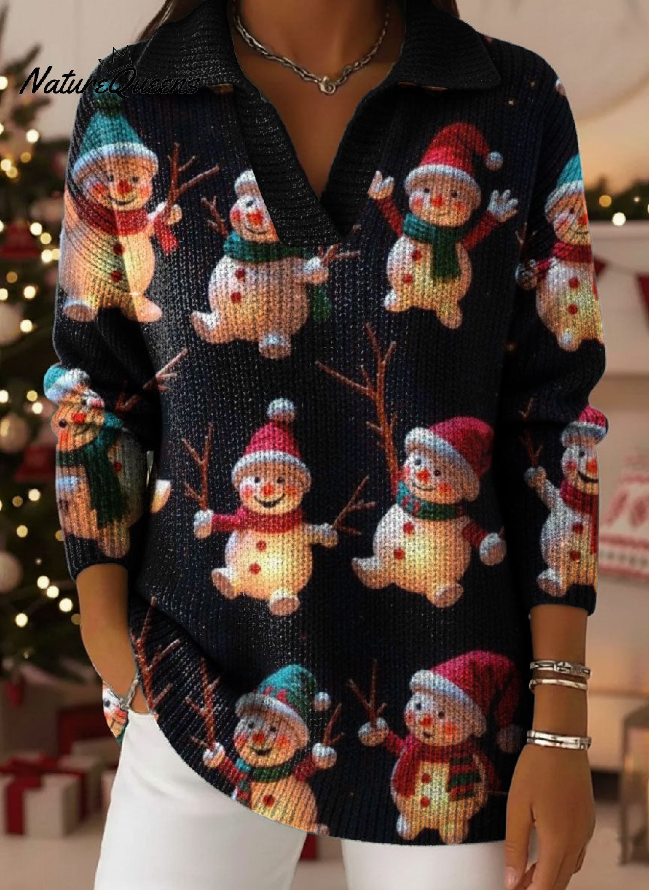 Neon Christmas Snowman Art Pattern Polo Collar Shiny Loose Sweater Top