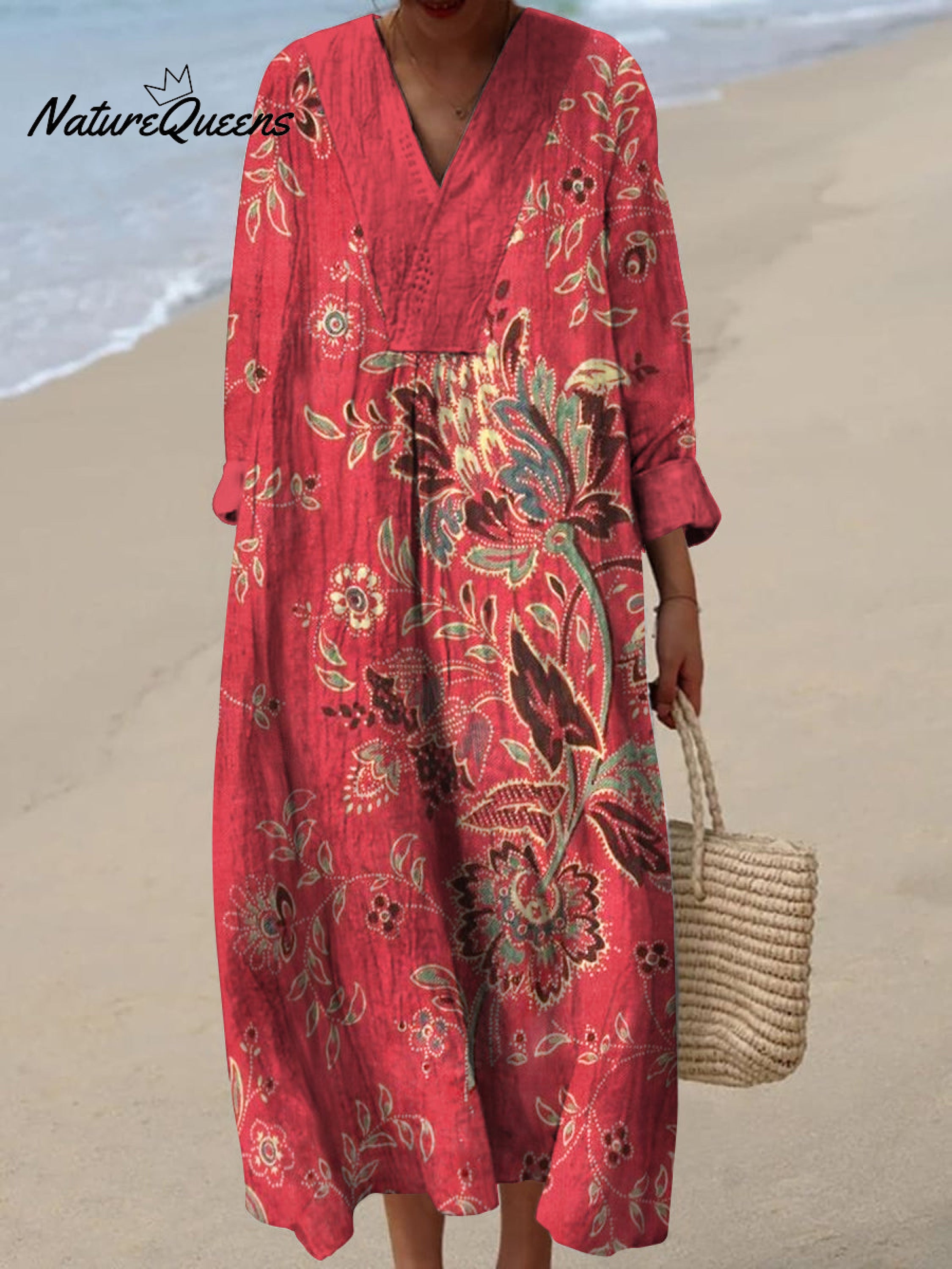 Retro Boho Blumen kunst bedruckt V-Ausschnitt Vintage schick lose lange Ärmel Midi-Kleid