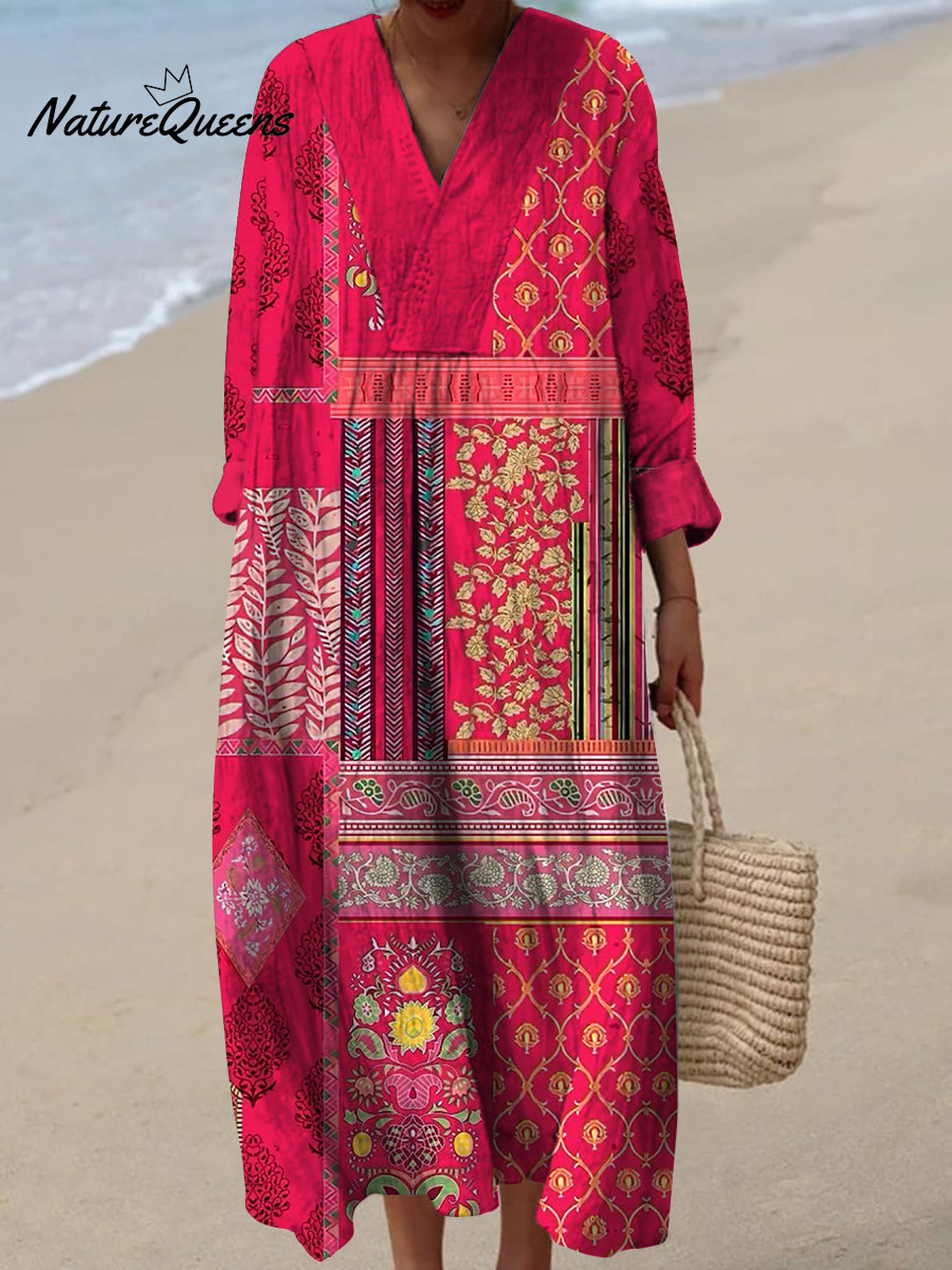 Retro Boho Blumen kunst bedruckt V-Ausschnitt Vintage schick lose lange Ärmel Midi-Kleid
