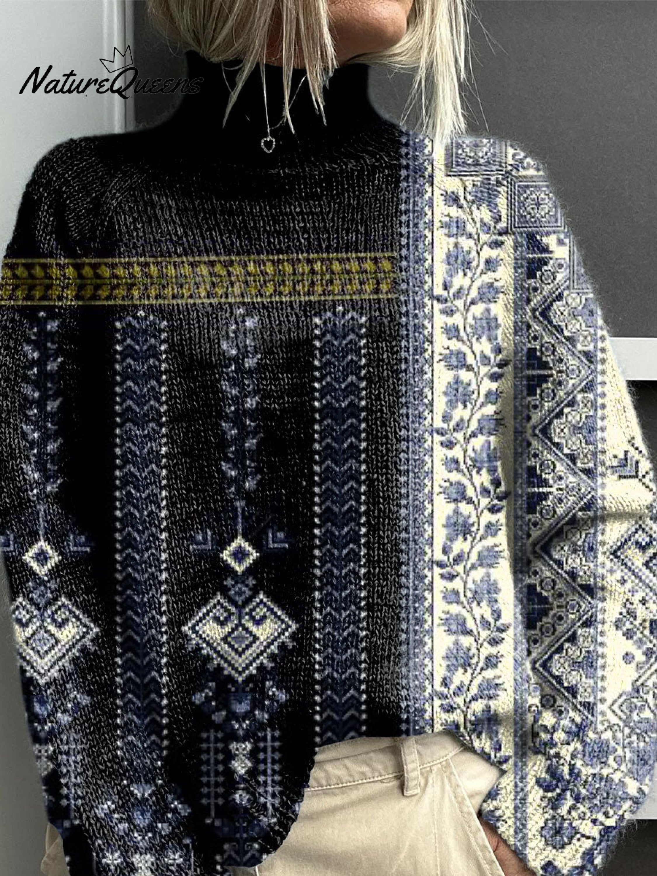 Retro Flowers Print Knit Turtleneck Pullover Sweater
