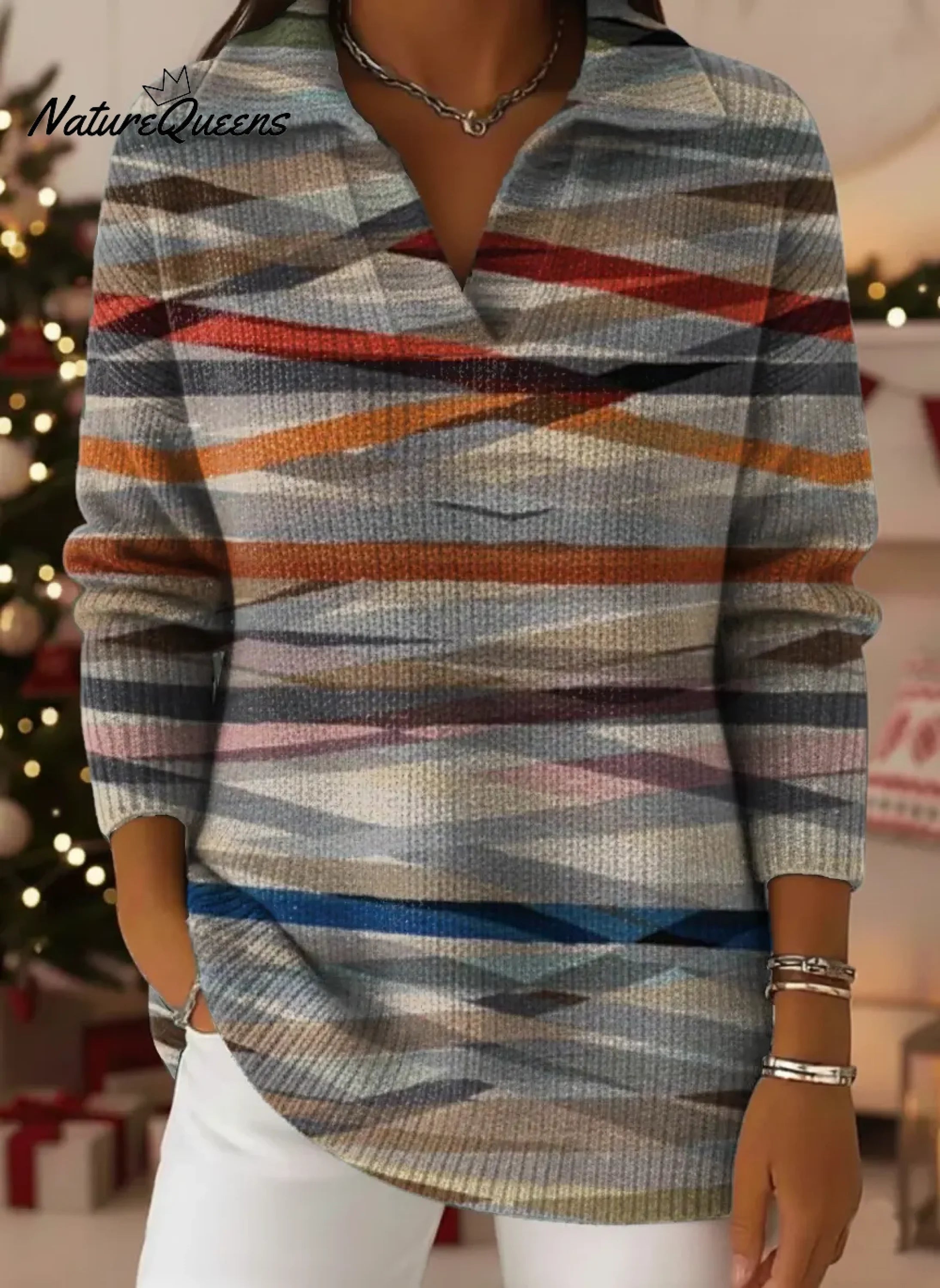 Retro Horizontal Stripes Print Lapel Casual Knit Sweater
