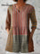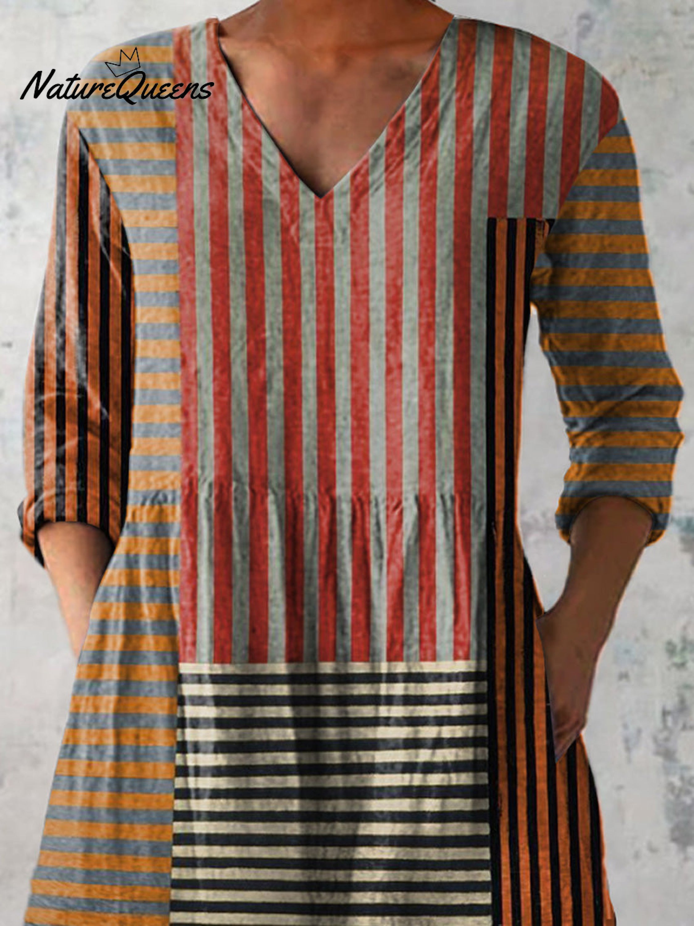 Strip Patchwork Pattern Printed Women's Casual Linen V-Neck Shirt