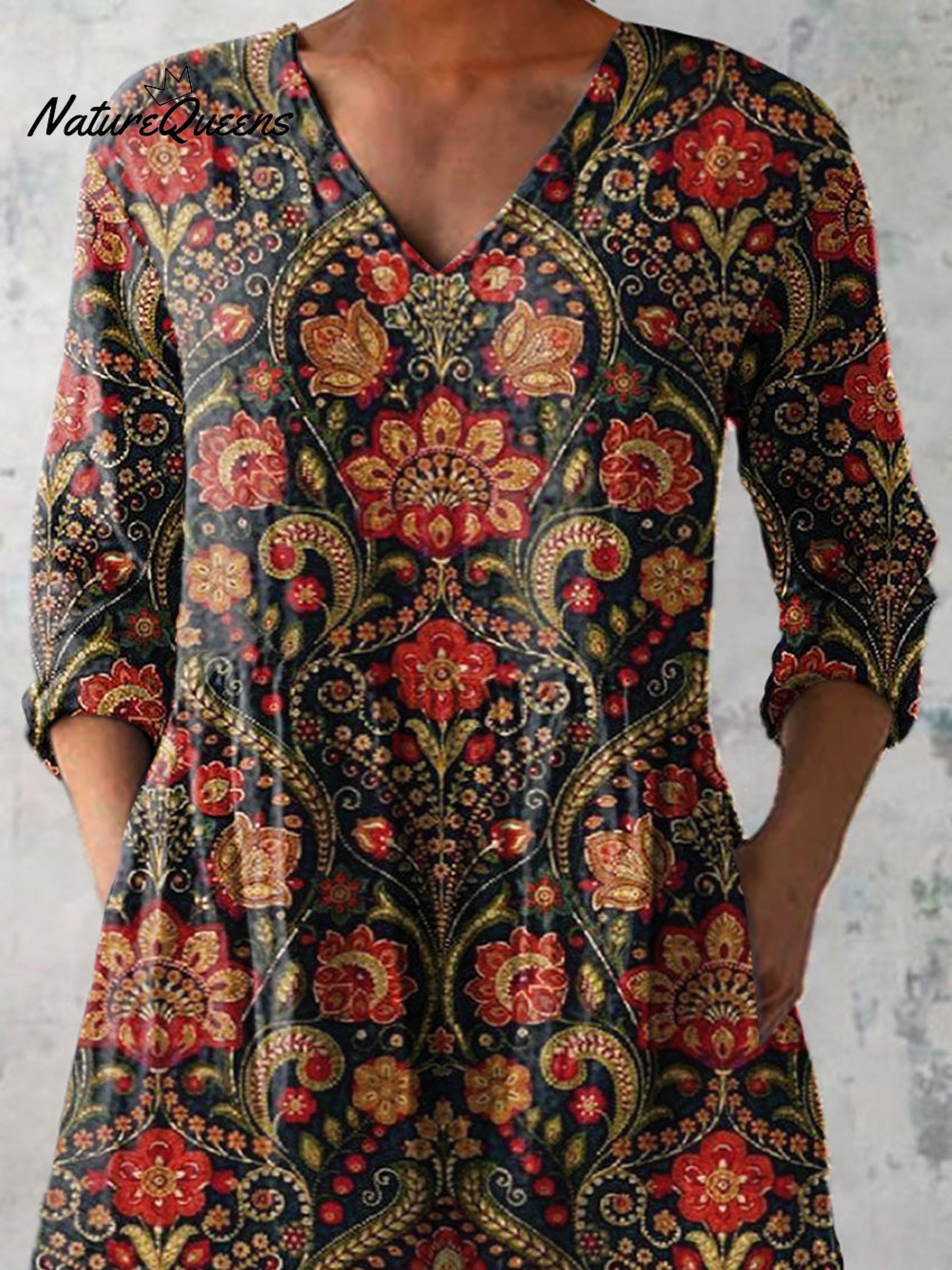 Summer Ethnic Floral Pattern Printed Women's Casual Linen V-Neck Shirt