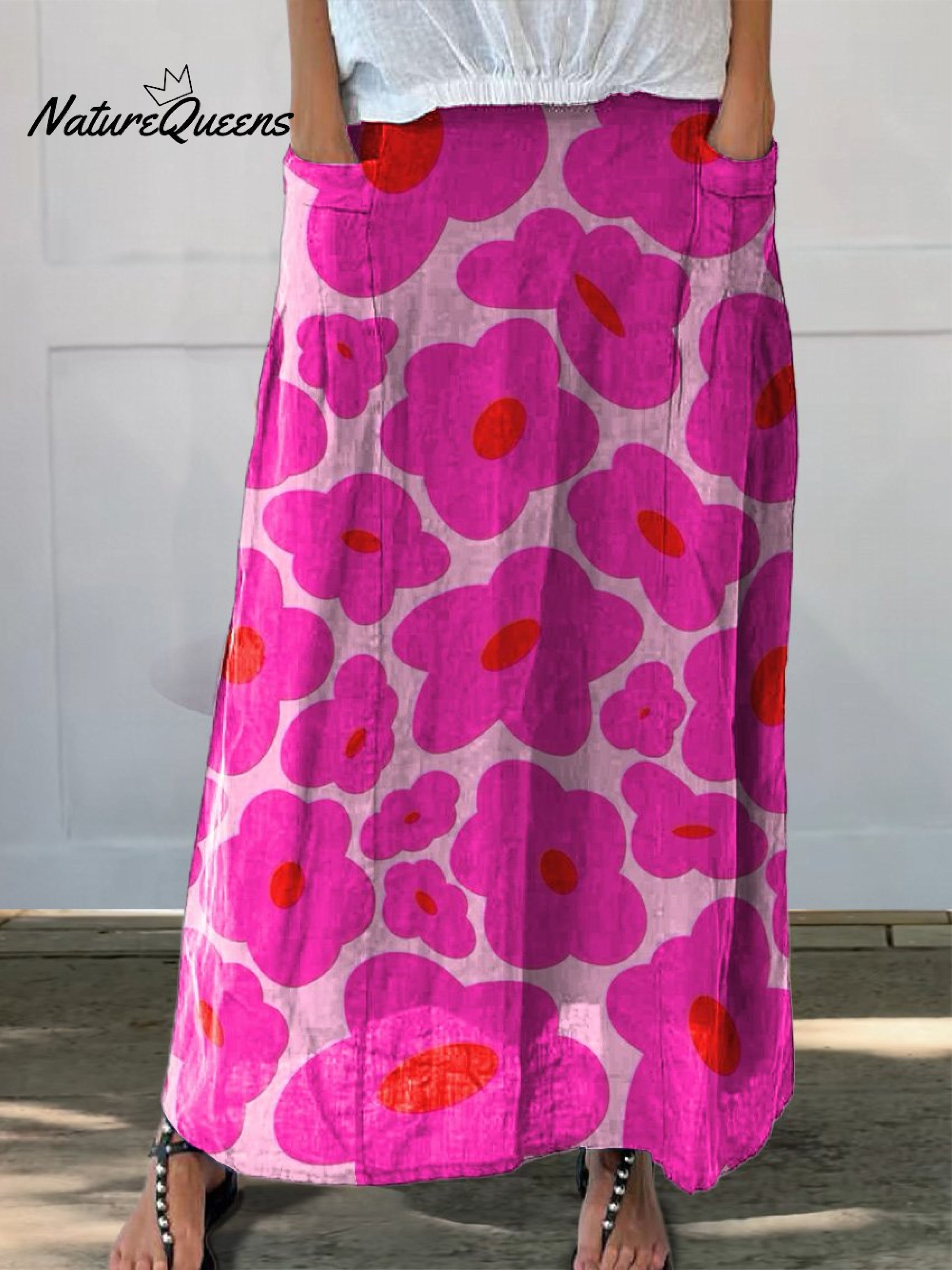 Vibrant Pink Floral Pattern Printed Women's Linen Pocket SkirtVibrant Pink Floral Pattern Printed Women's Linen Pocket Skirt