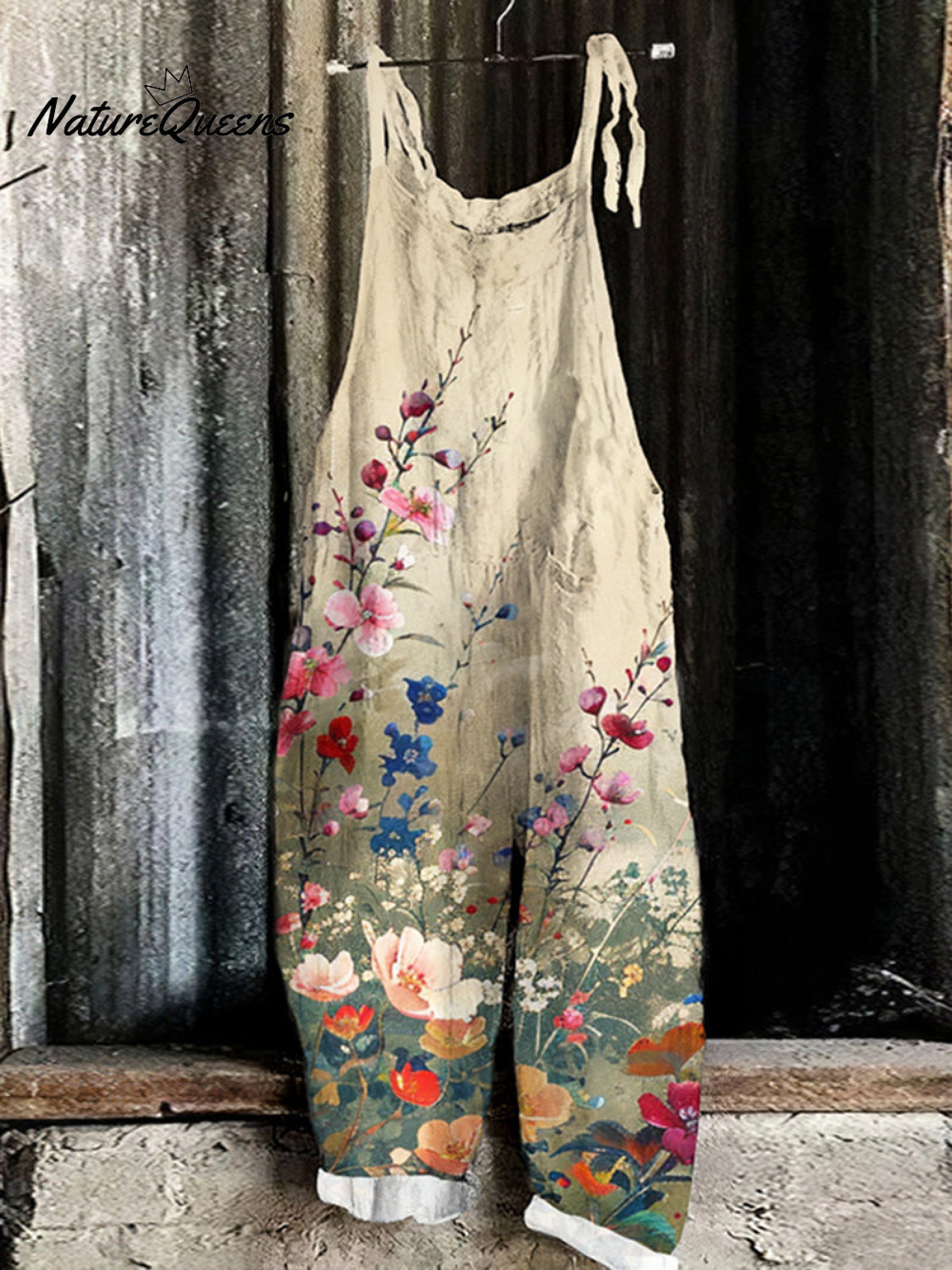 Vintage Flowers Art Print Linen Loose Casual Jumpsuit