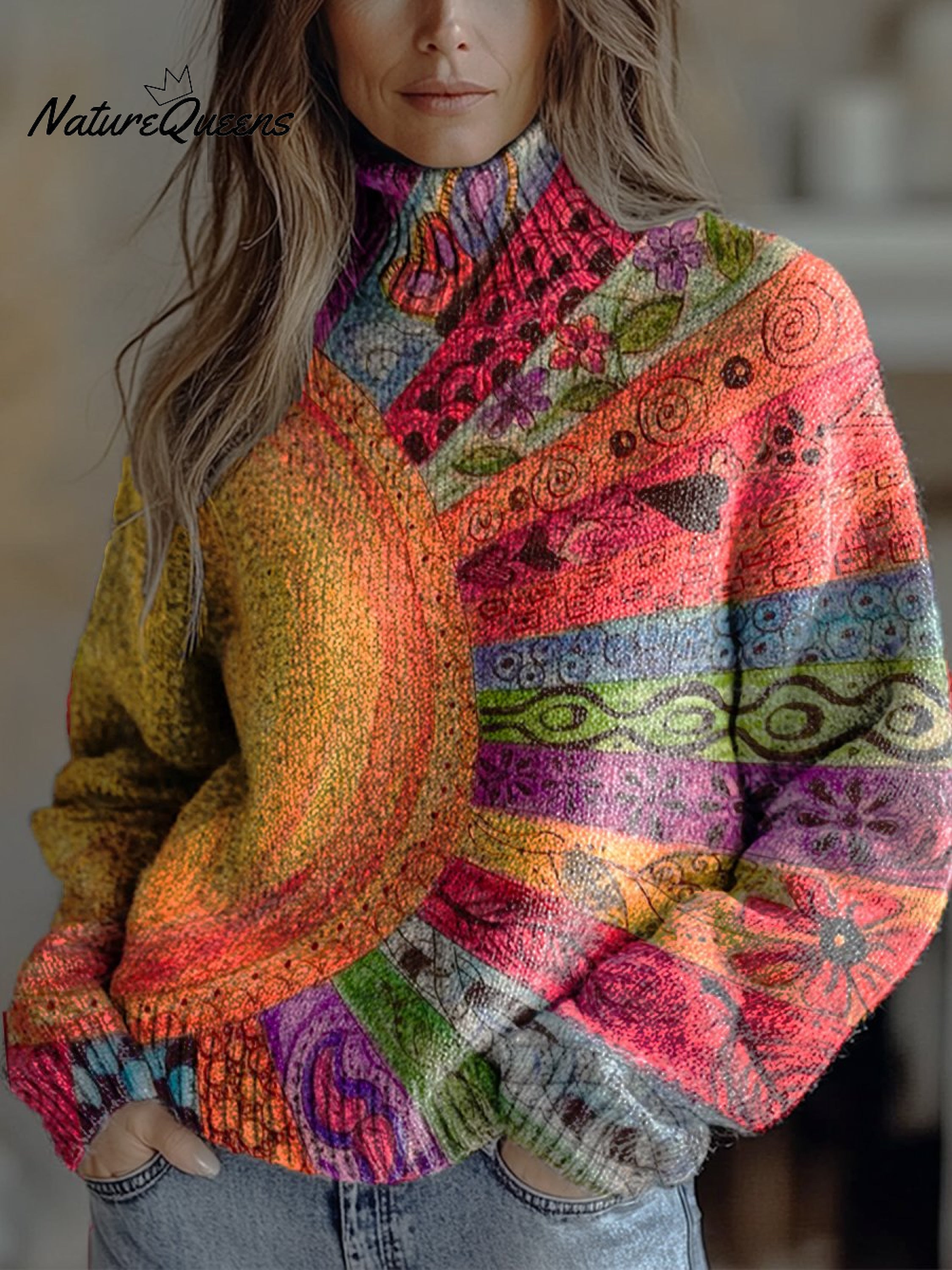 Vintage Panelled Sunburst Pattern Print Knit Turtleneck Pullover Sweater