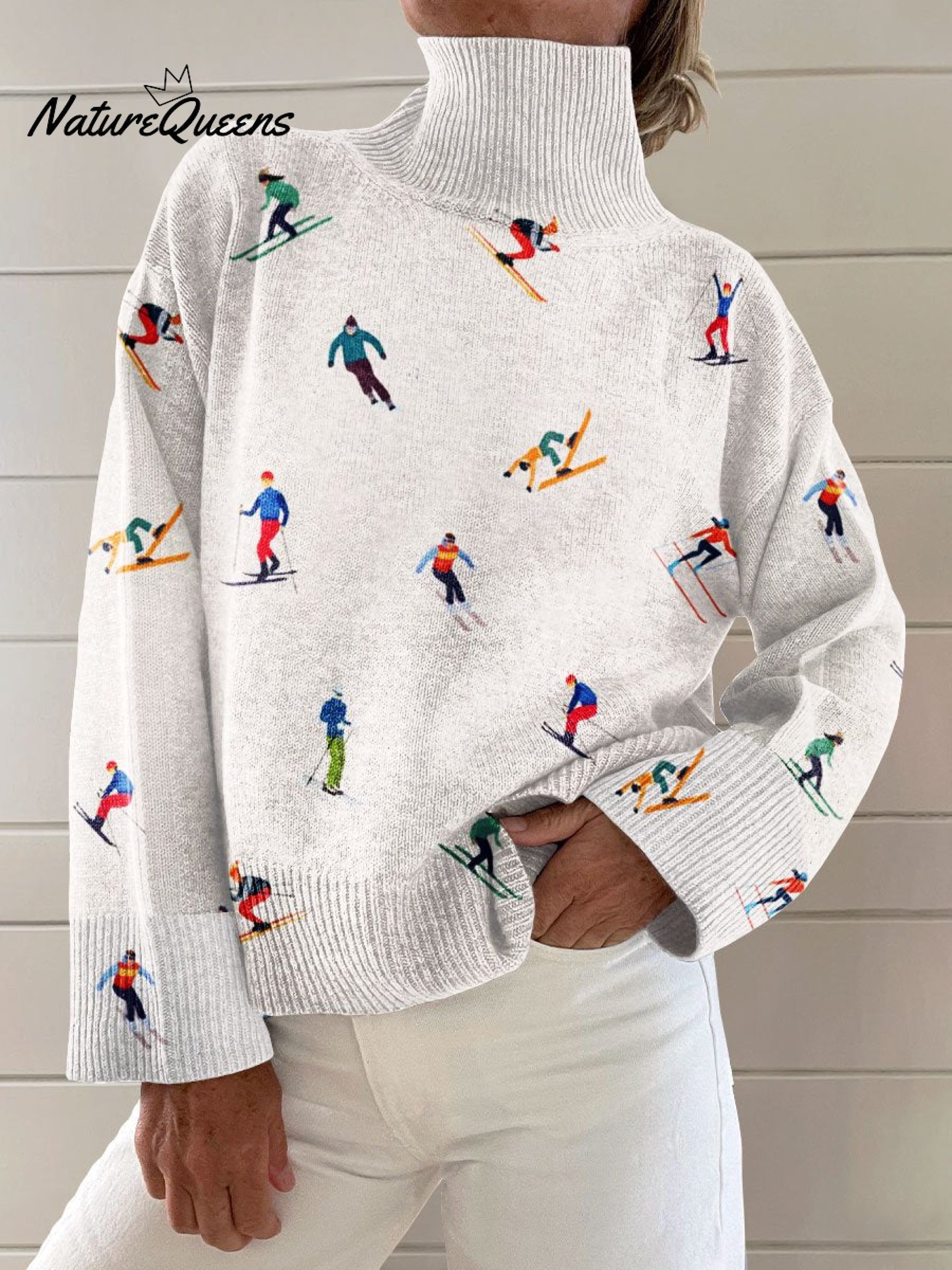 Vintage Winter Ski Print Knit Turtleneck Pullover Sweater