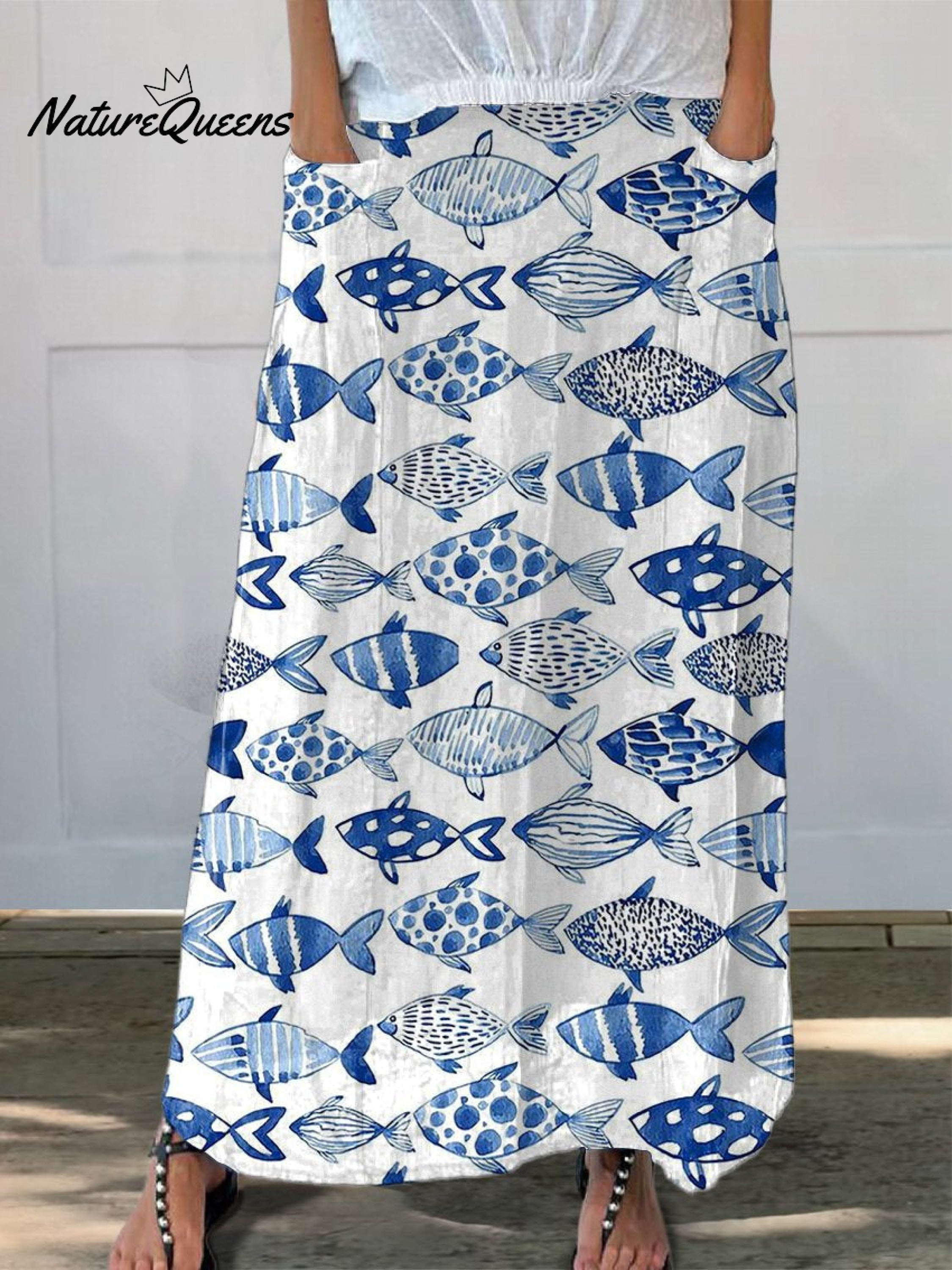 Watercolor Sea Fish Pattern Printed Women's Linen Pocket Skirt