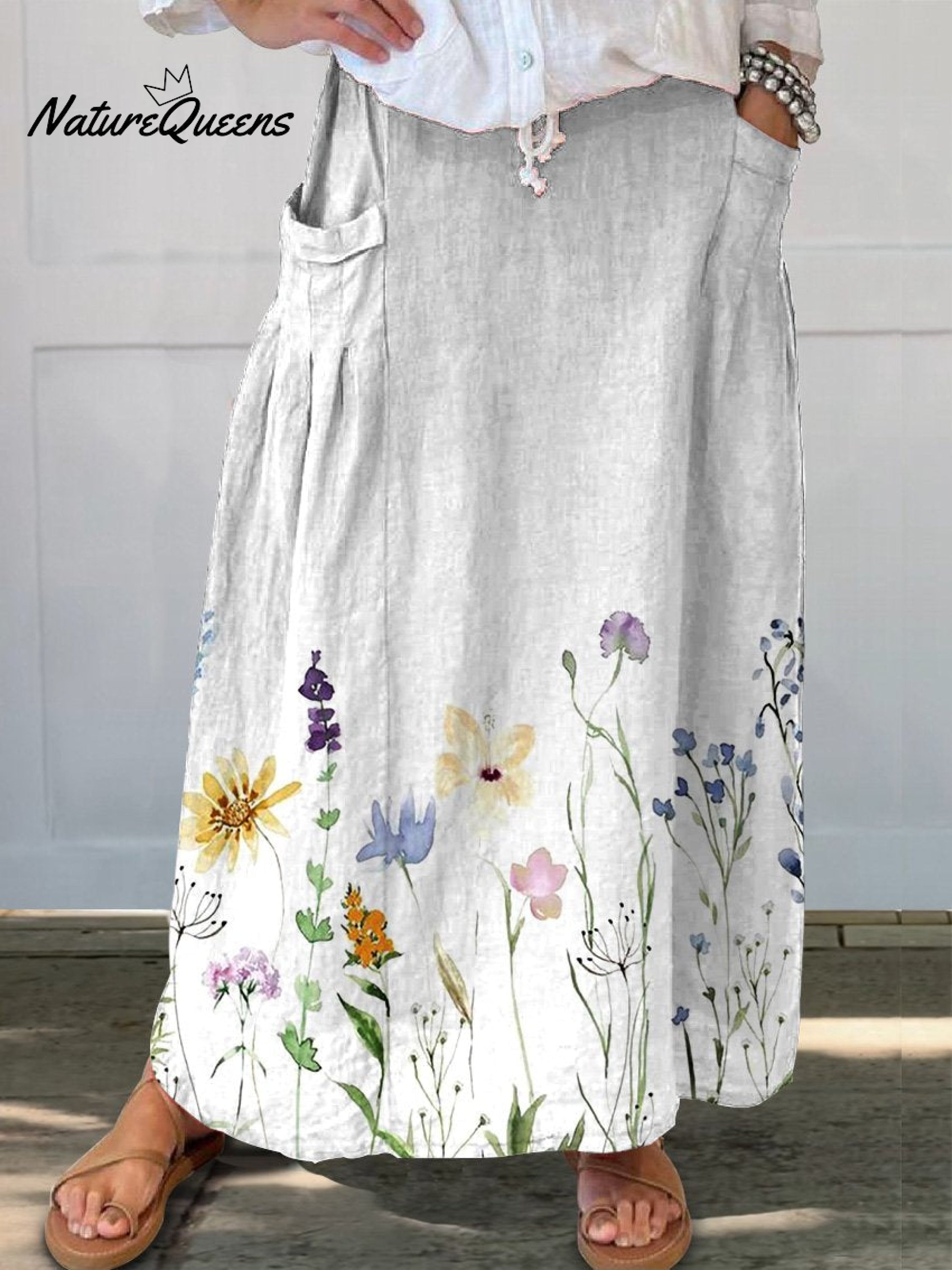 Watercolor Spring Meadows Art Printed Women's Linen Elastic waistband Pocket Skirt
