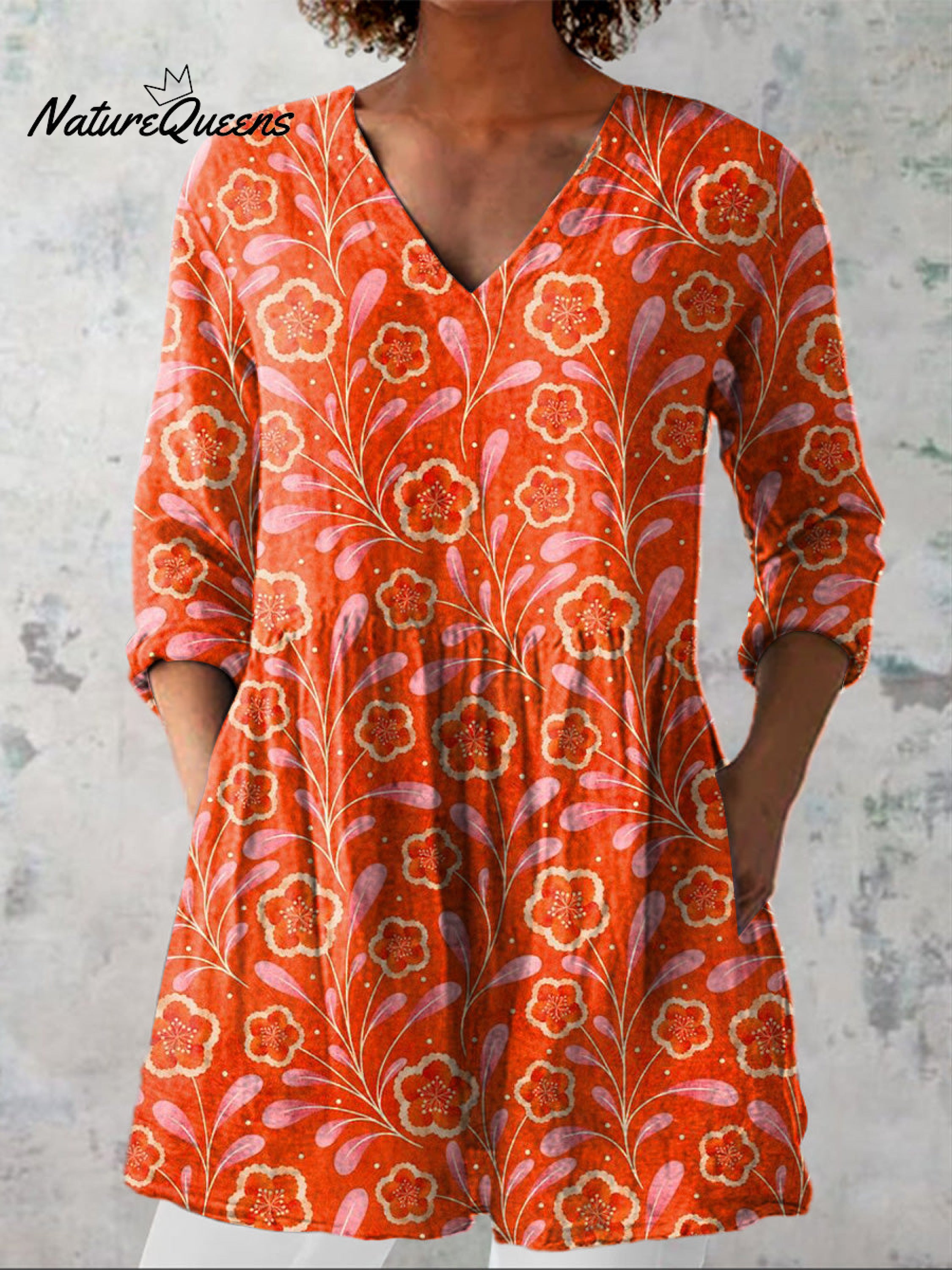 Watercolor Summer Floral Pattern Printed Women's Casual Linen V-Neck Shirt