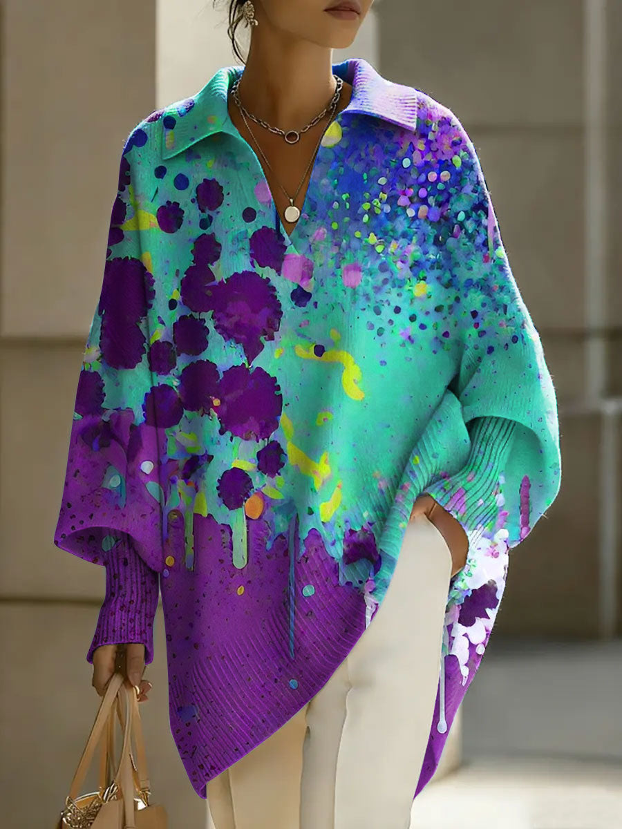 Women's Abstract Art Geometry Patterns V-neck Long-sleeved Casual Loose-fitting Knitted Pullover Sweater