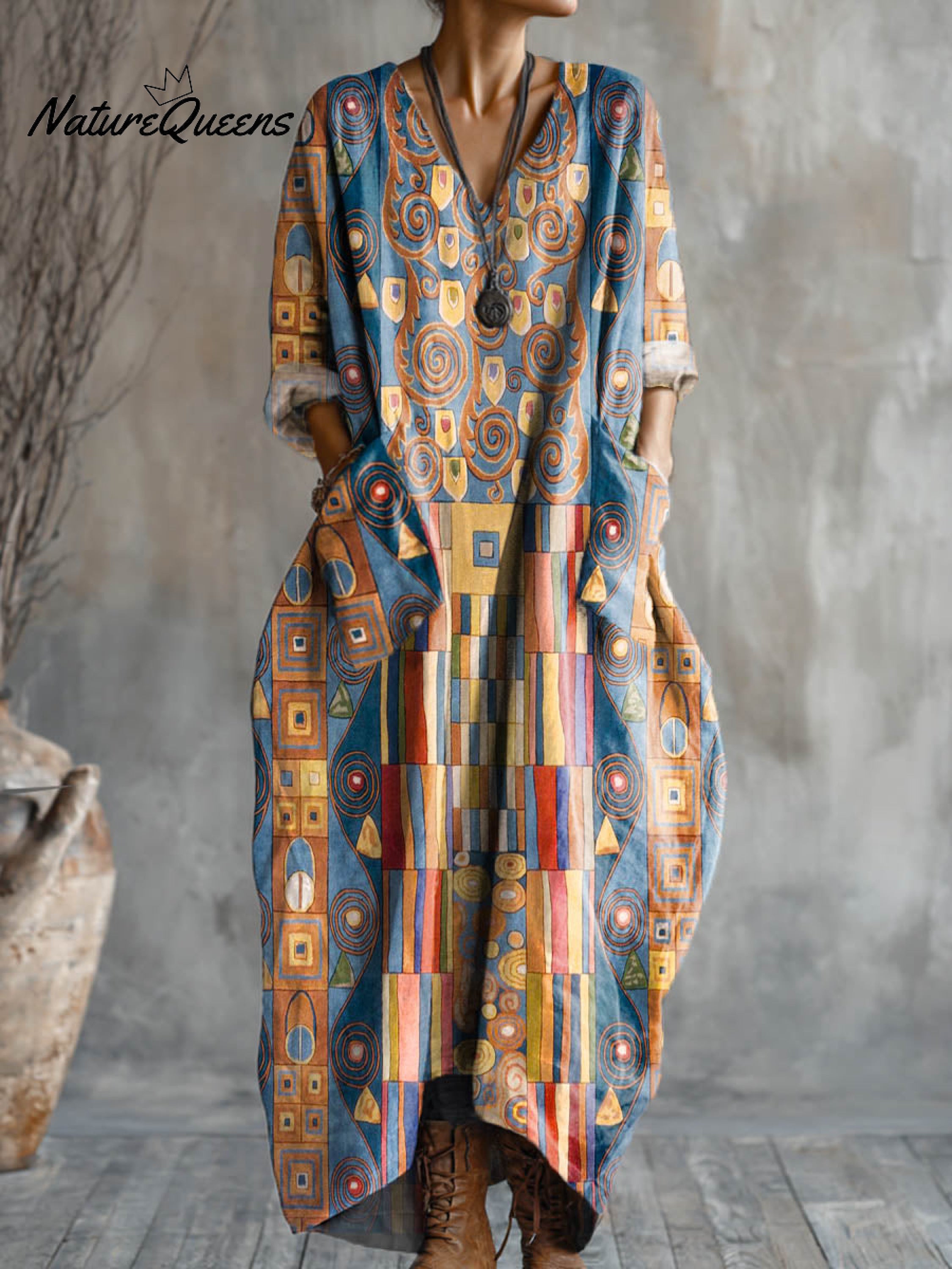 Women's Abstract Geometric Pattern Art Print Pocket V-neck Cotton Dress