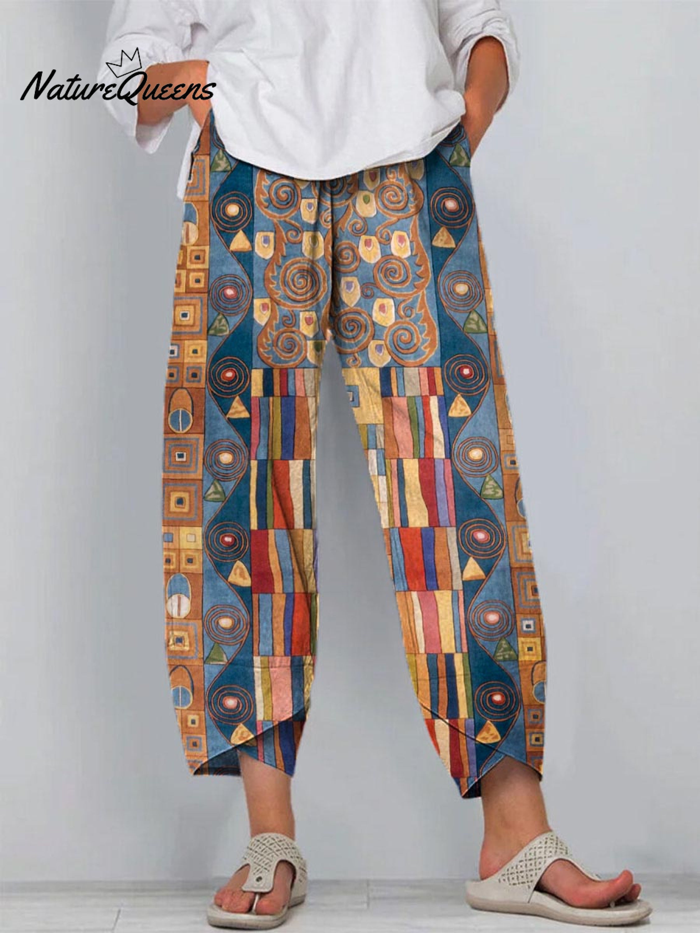Women's Abstract Geometric Pattern Art Printed Cotton And Linen Casual Pants