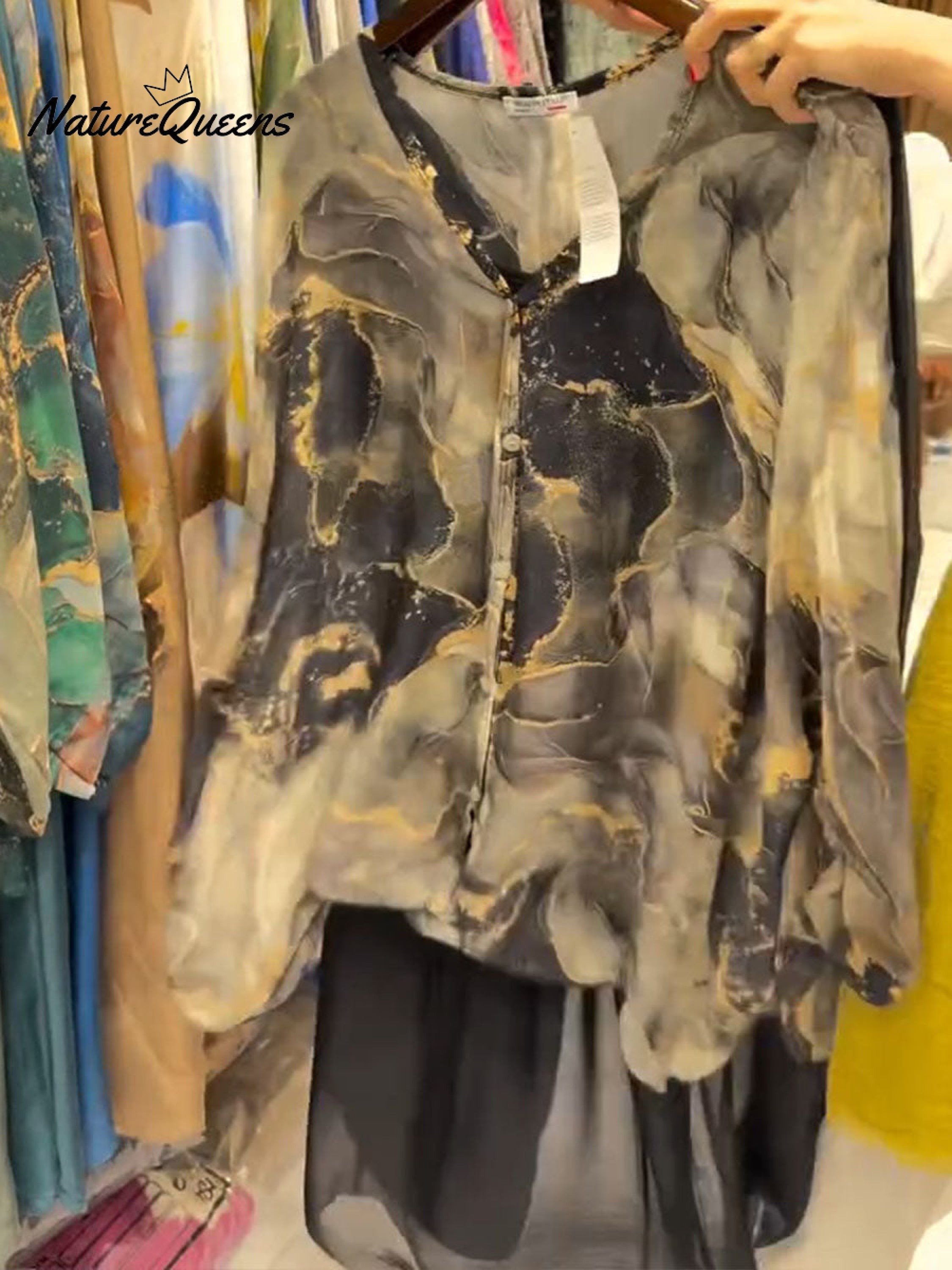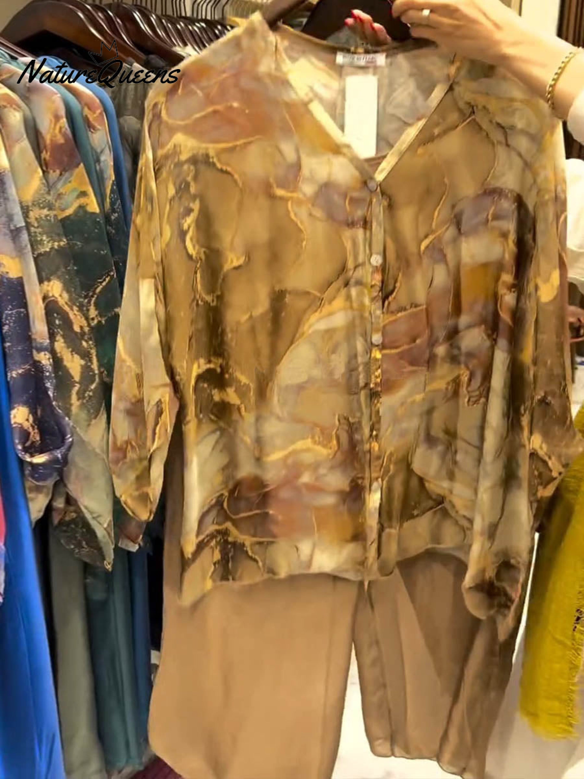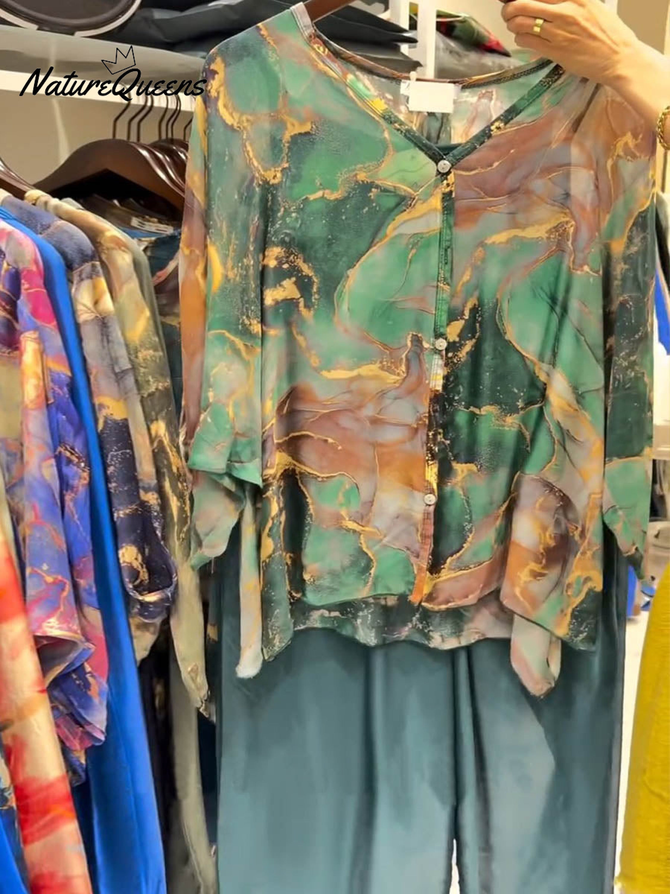 Women's Abstract Print V-Neck 3/4 Sleeve Casual Loose Cardigan Top Elastic Waist Solid Color Wide-Leg Pants Set