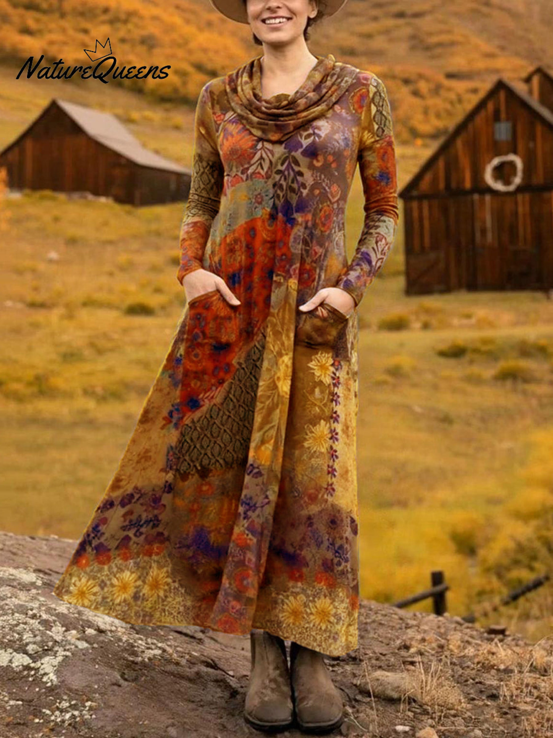 Women's Boho Boat-Shaped Collar Floral Print Stretch Dress