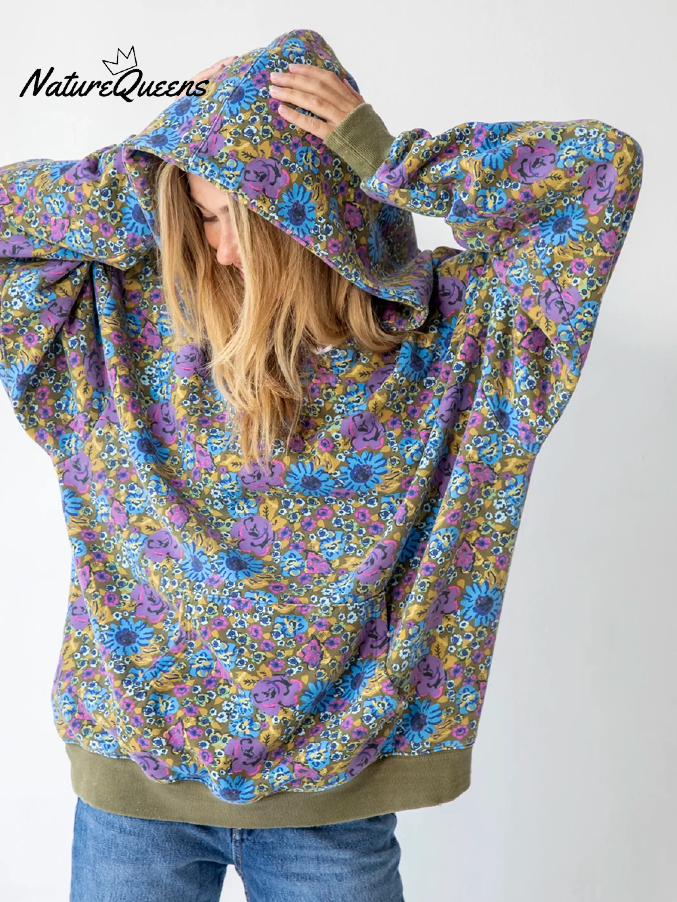 Women's Boho Floral Print Colorblock Cuff Cotton Hoodie