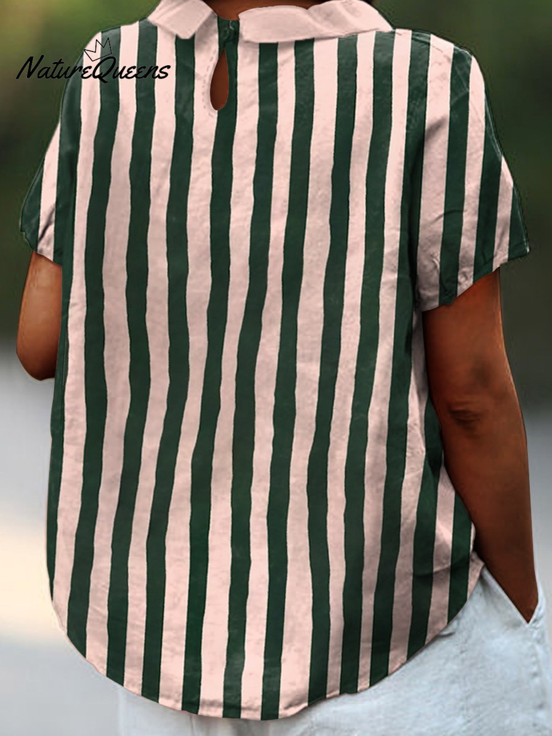 Women's Canned Pink-green Striped Sardines Print Casual Cotton And Linen Shirt