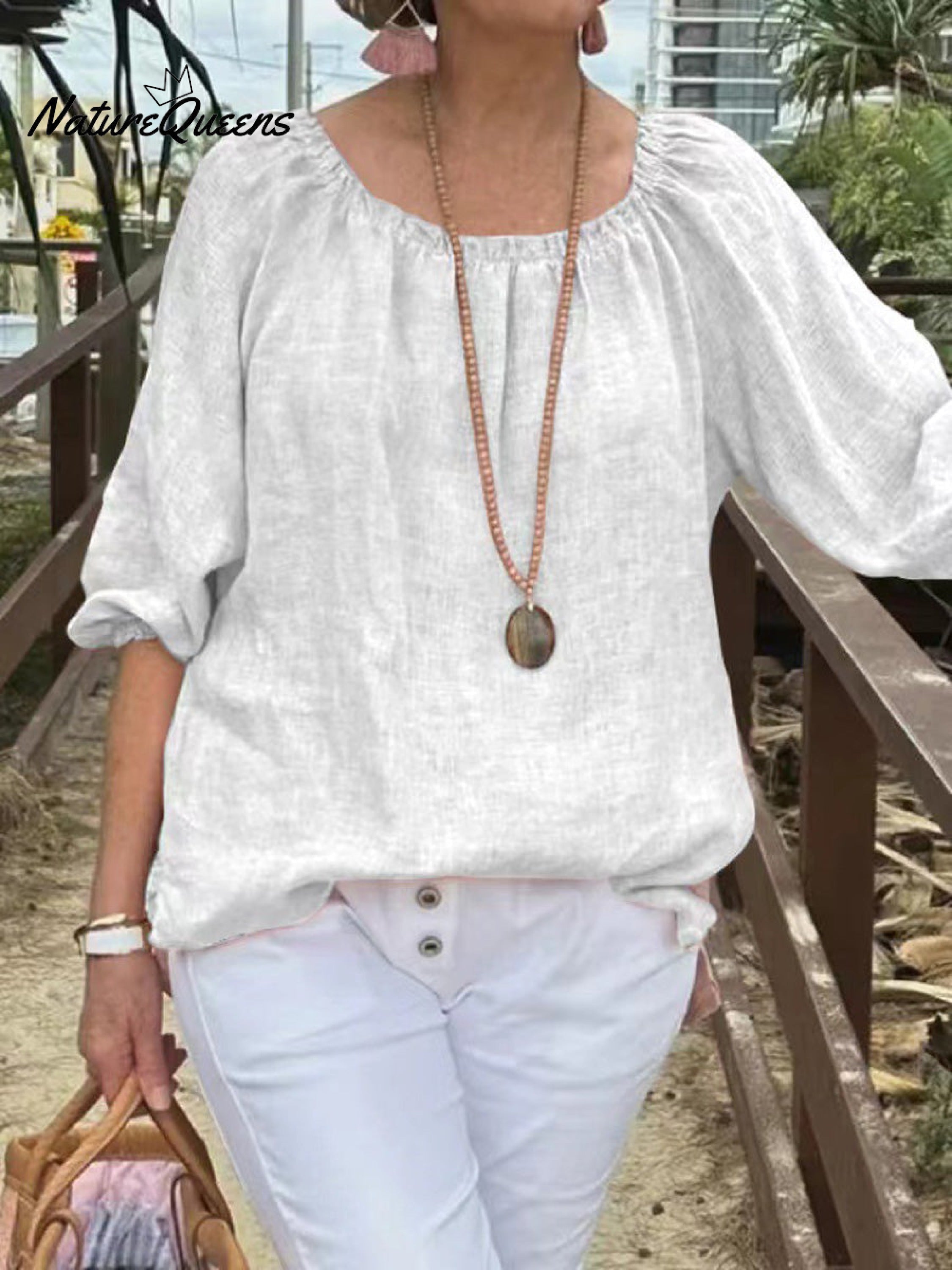Women's Casual Solid Color Round Neck Pullover Cotton And Linen Shirt