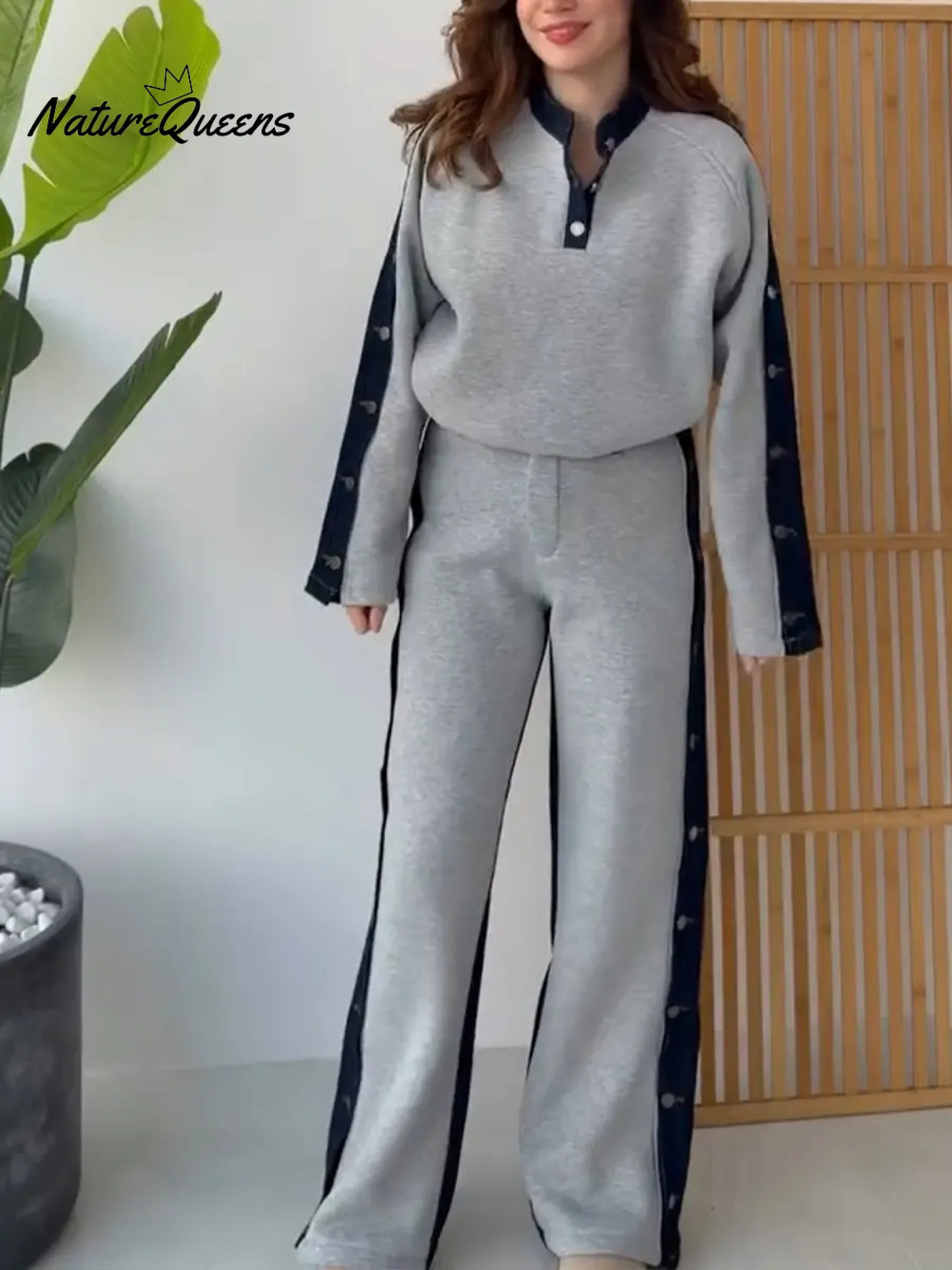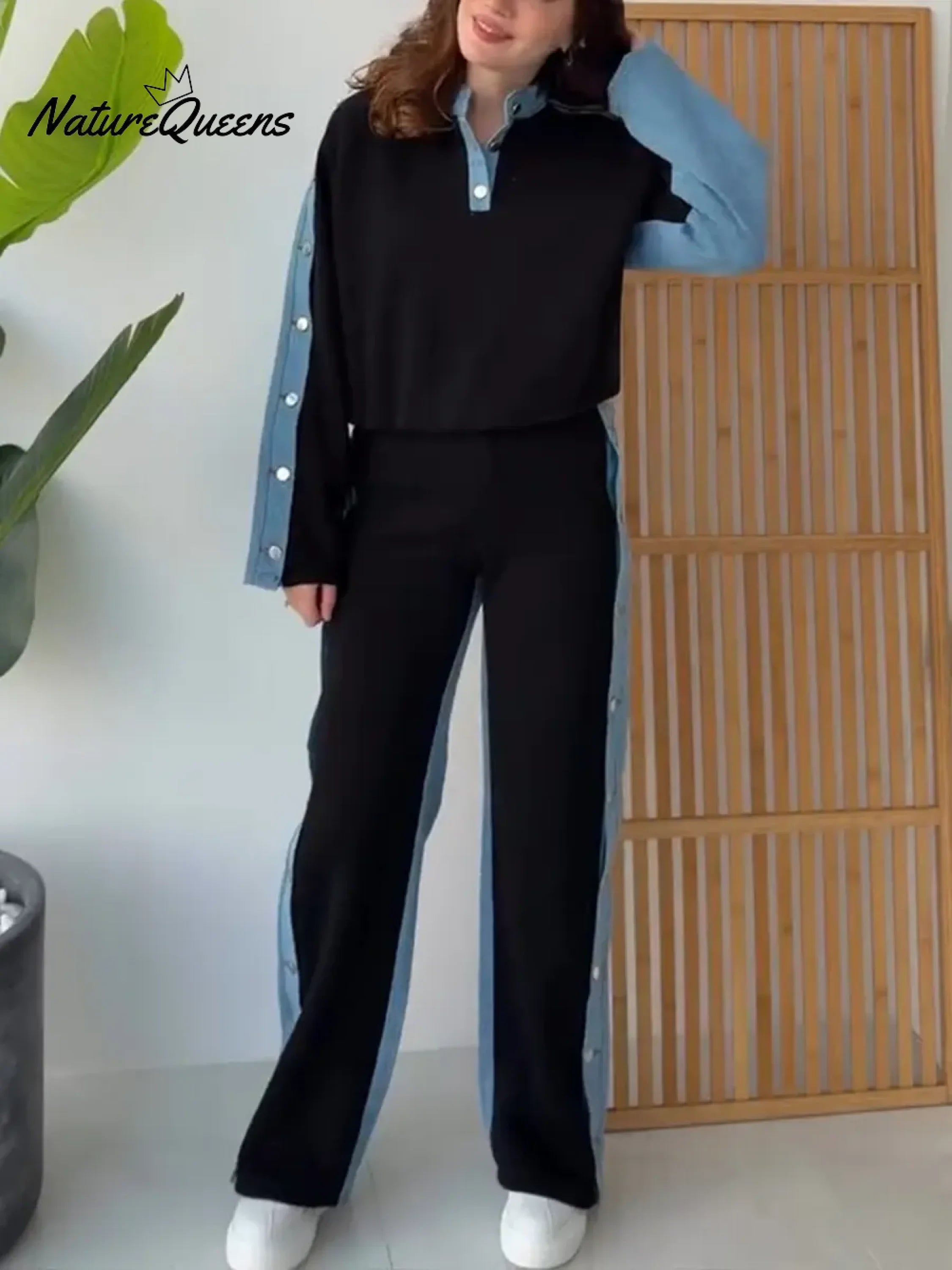 Women's Color-blocked Cardigan Collar Long-sleeved Casual Loose Top And High-waisted Casual Loose Color-blocked Wide-leg Pants SWomen's Color-blocked Cardigan Collar Long-sleeved Casual Loose Top And High-waisted Casual Loose Color-blocked Wide-leg Pants S