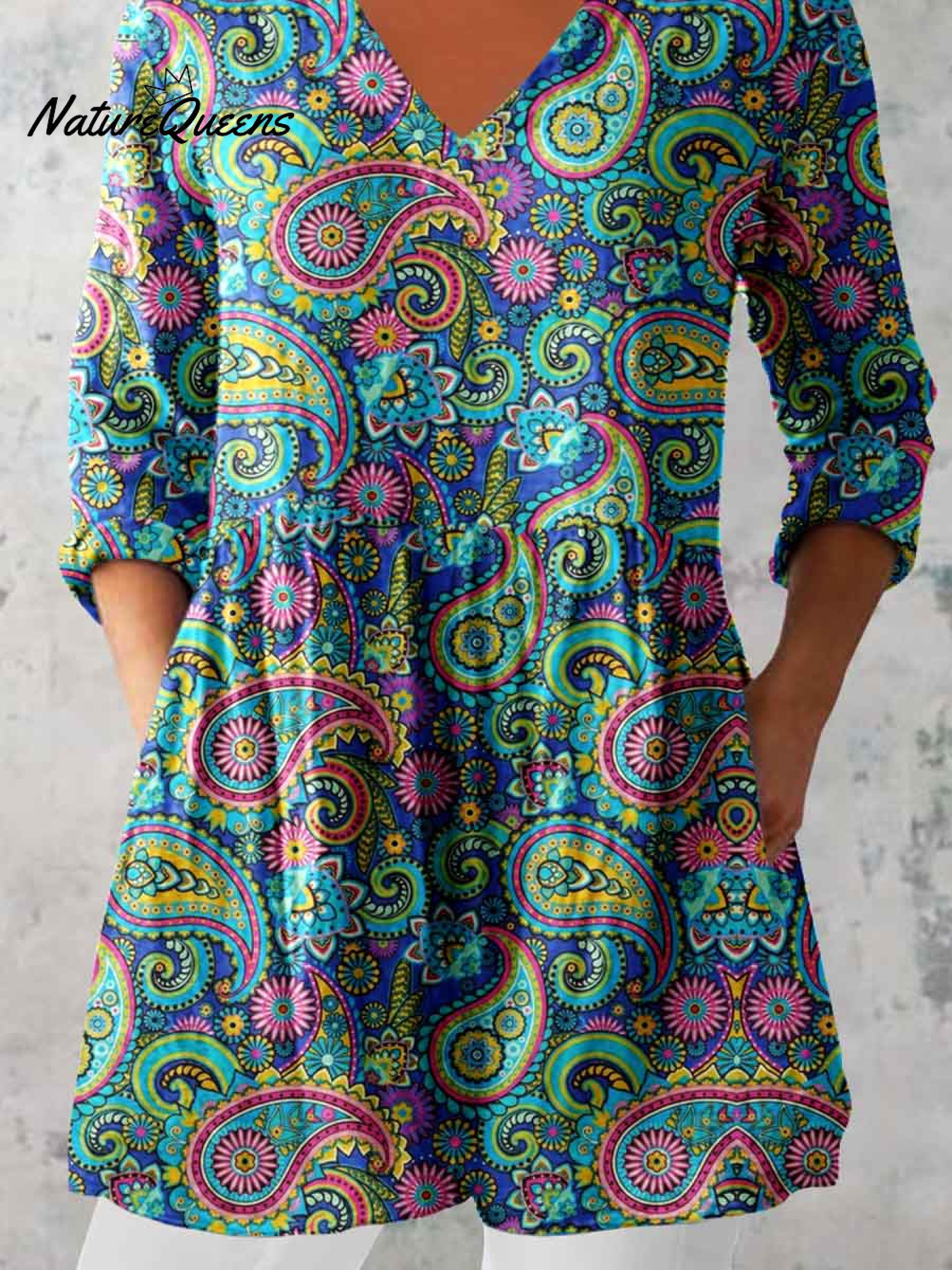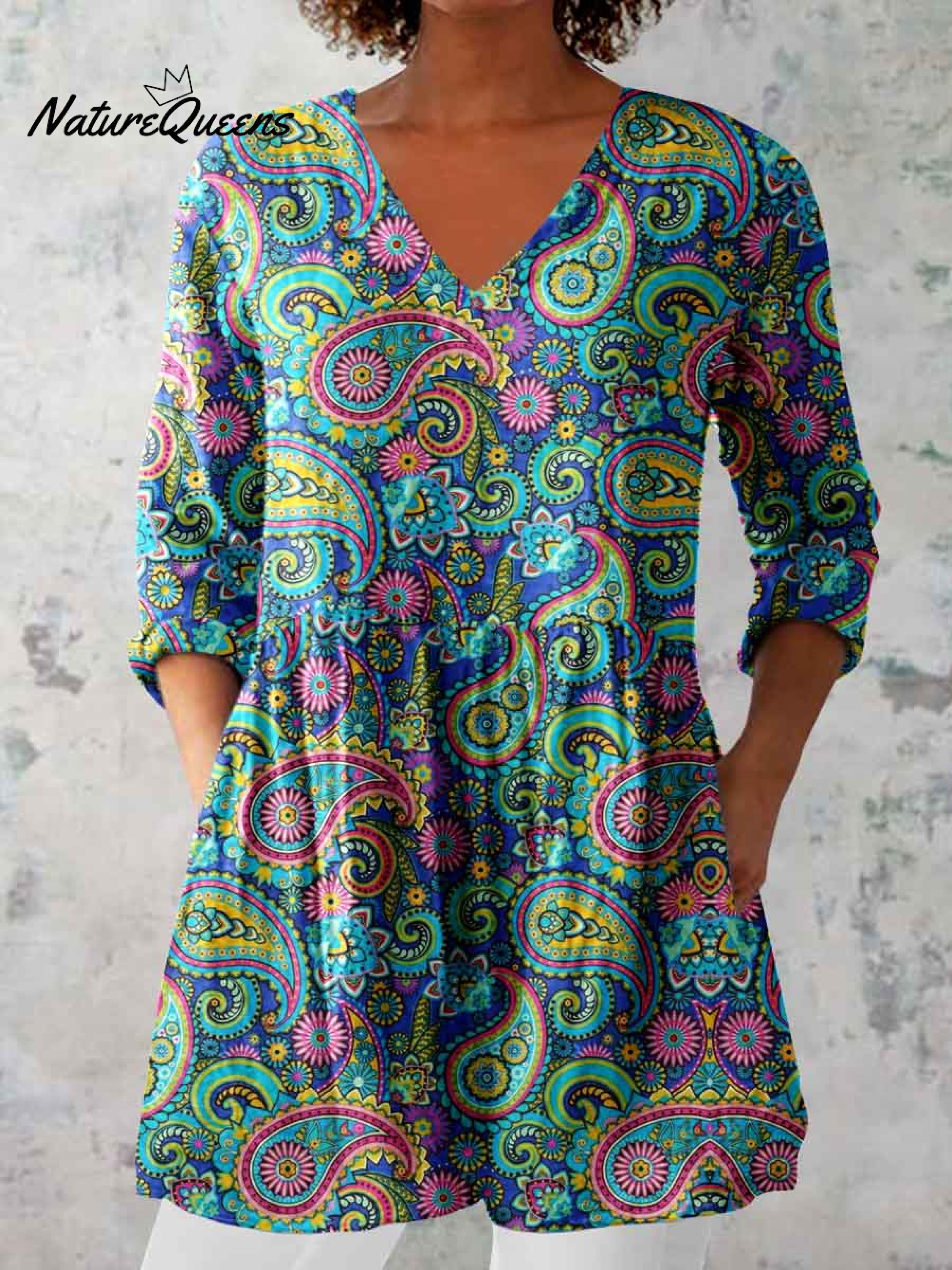 Women's Elegant Peris Pattern Crew Neck Cotton and Linen Top