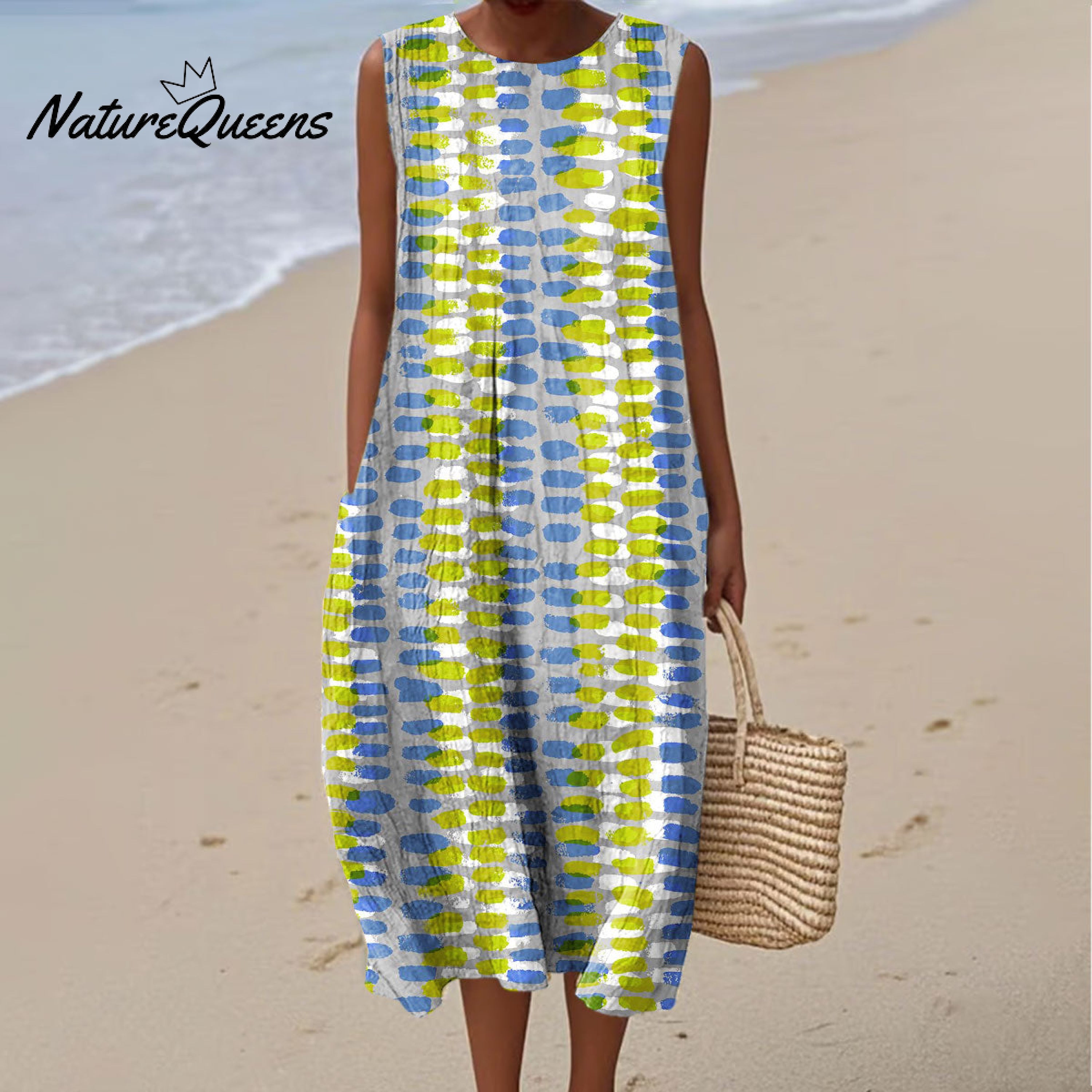Women's Fashion Color Block Art Print Sleeveless Cotton Pocket Wrap Dress