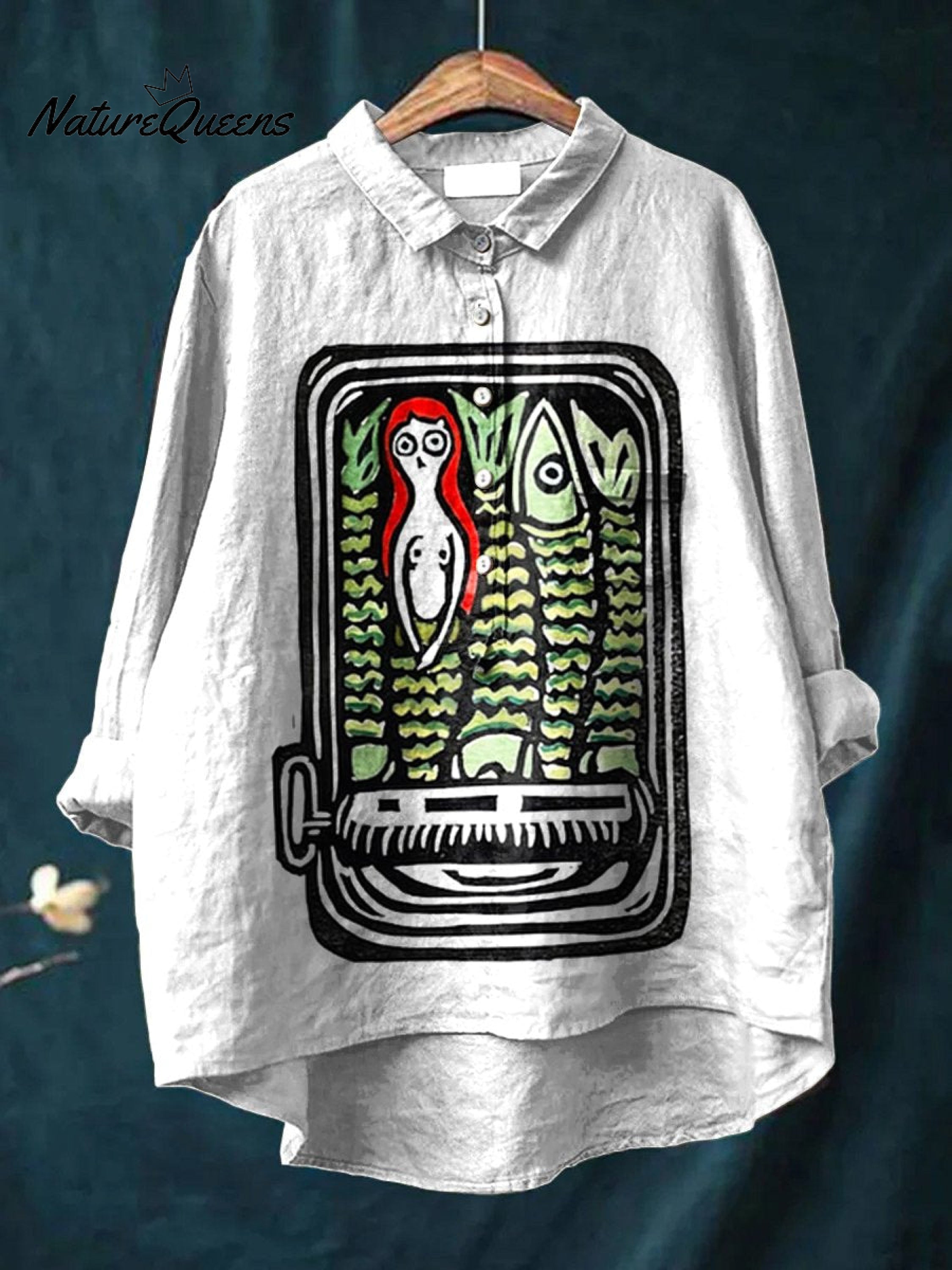 Women'sFish Girl Art Print Casual Cotton And Linen Shirt