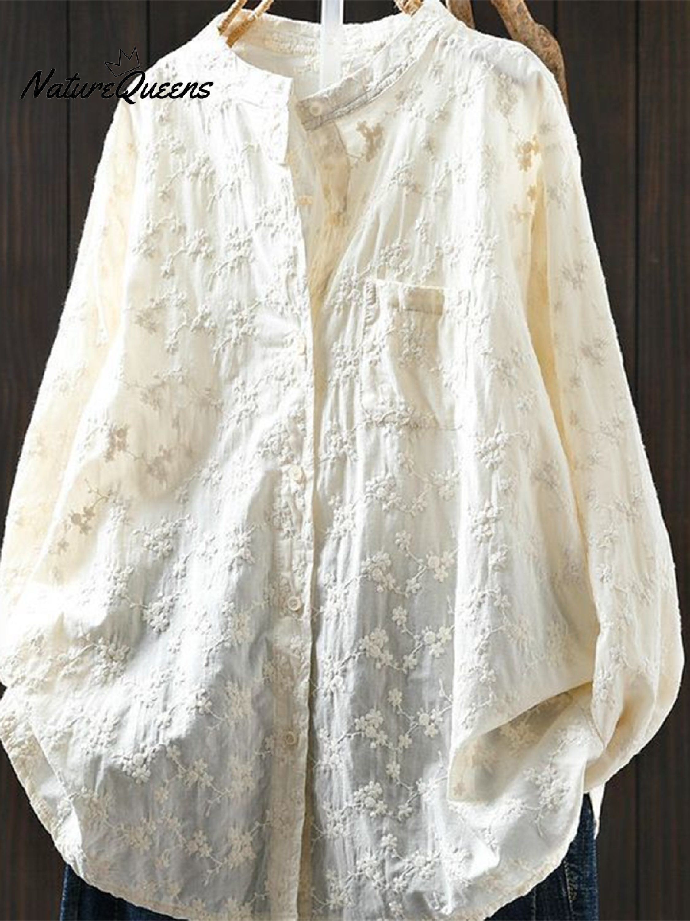 Women's Floral Embroidered Stand-up Collar Cotton Shirt