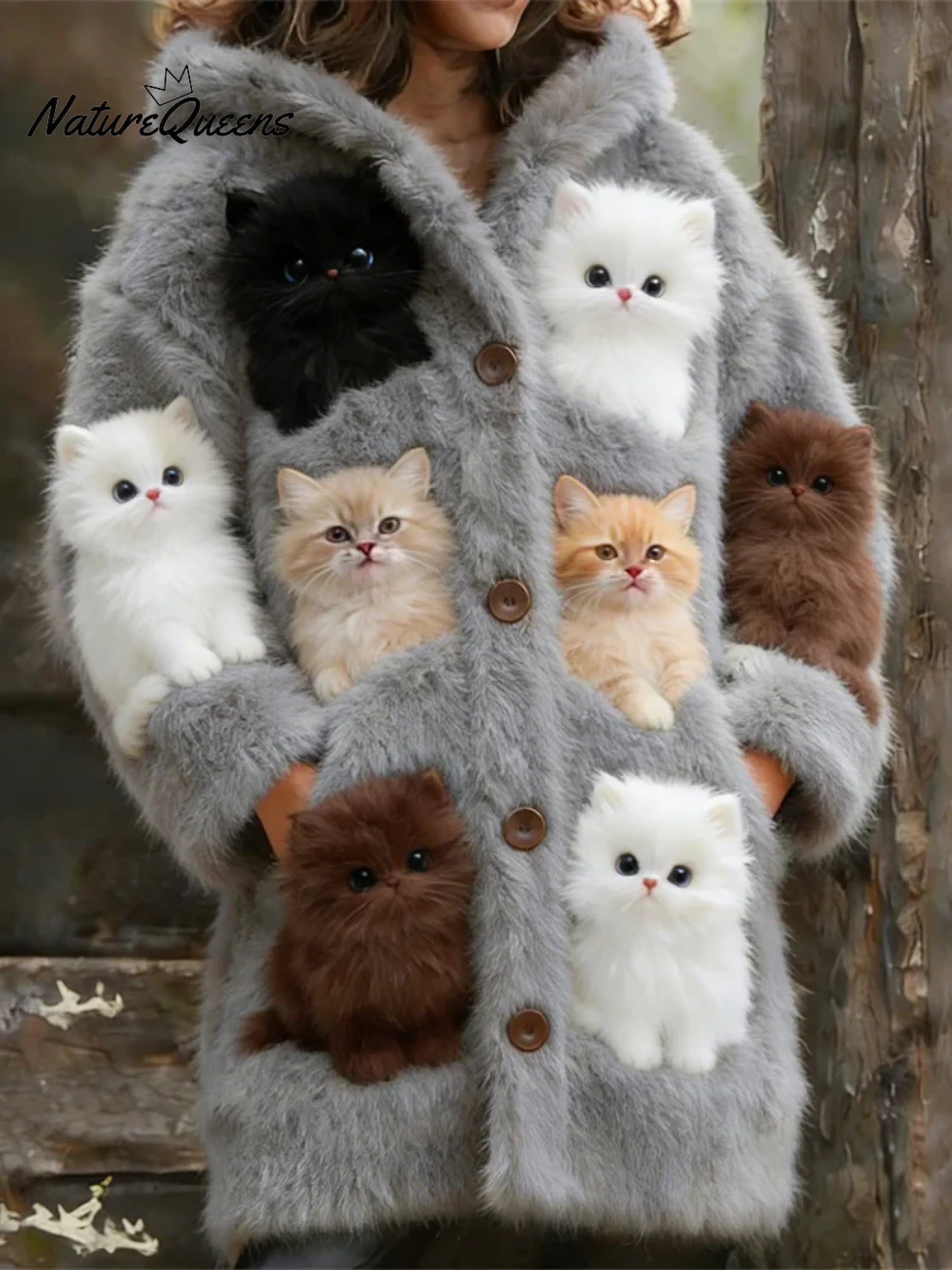 Women's Funny Cats Pattern Art Print Casual Fleece Coat