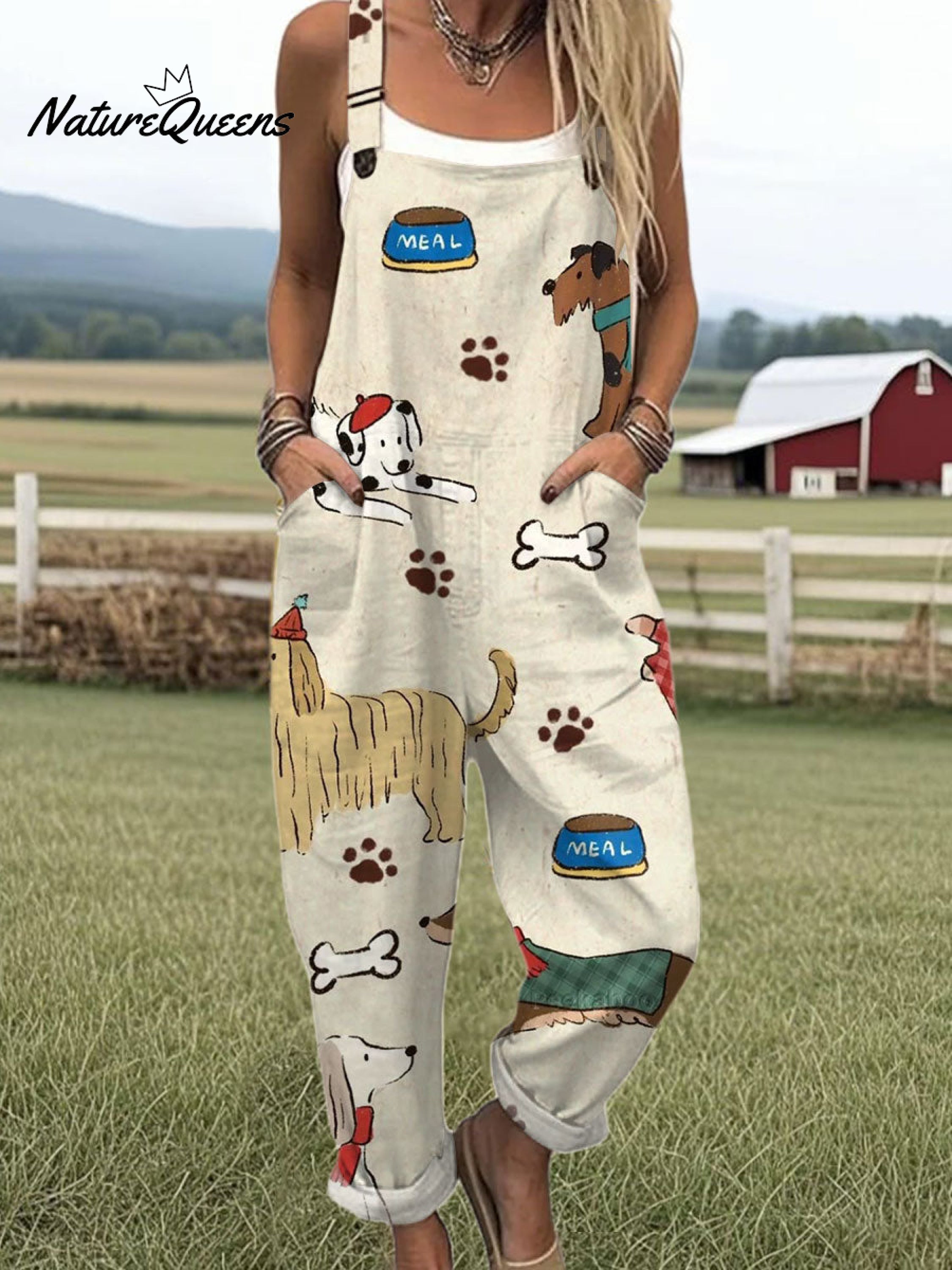 Women's Funny Dog Art Print Casual 100% Cotton Wide Leg Jumpsuit