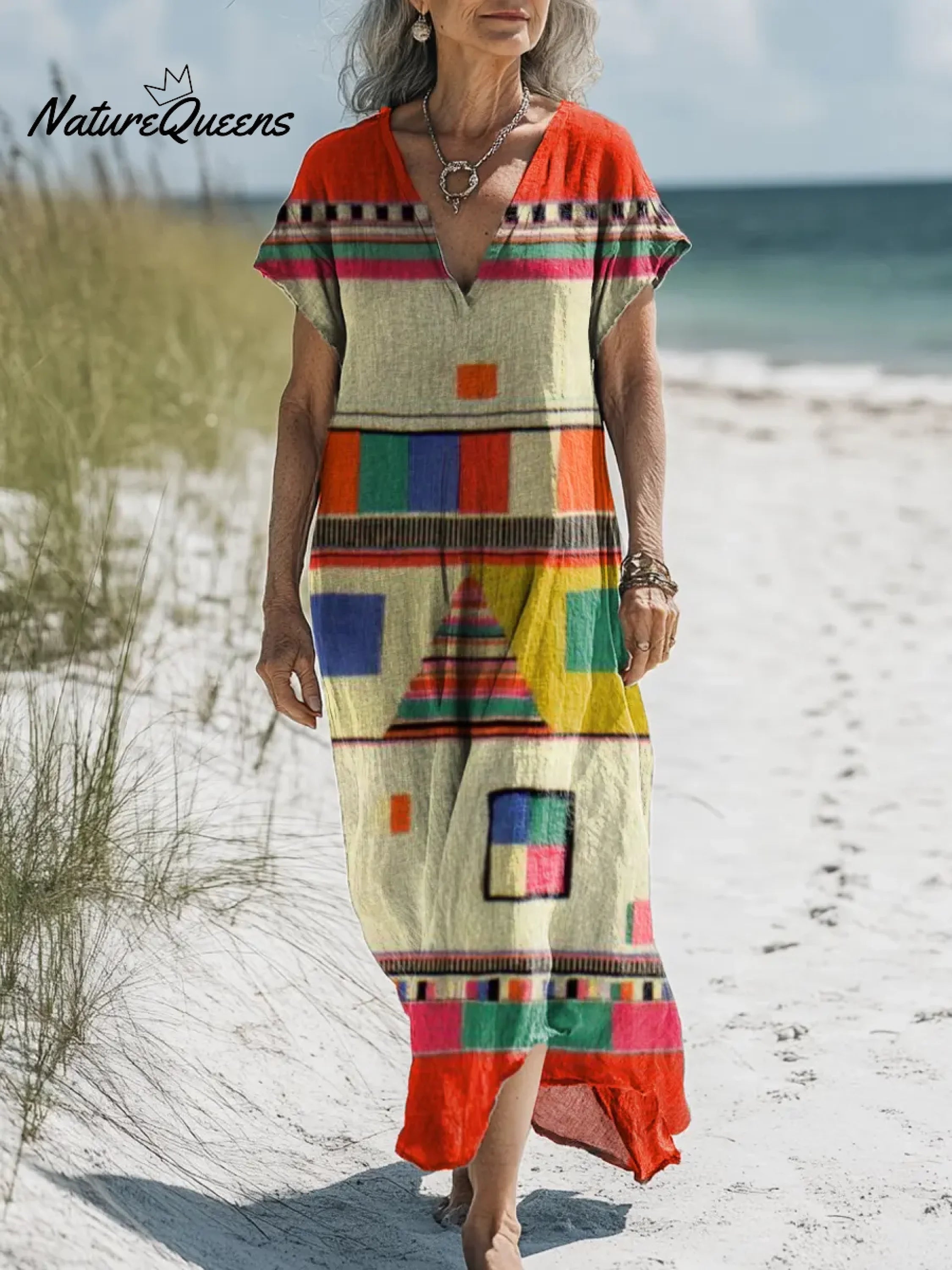 Women's Geometric Pattern Art Print Casual Cotton And Linen Dress