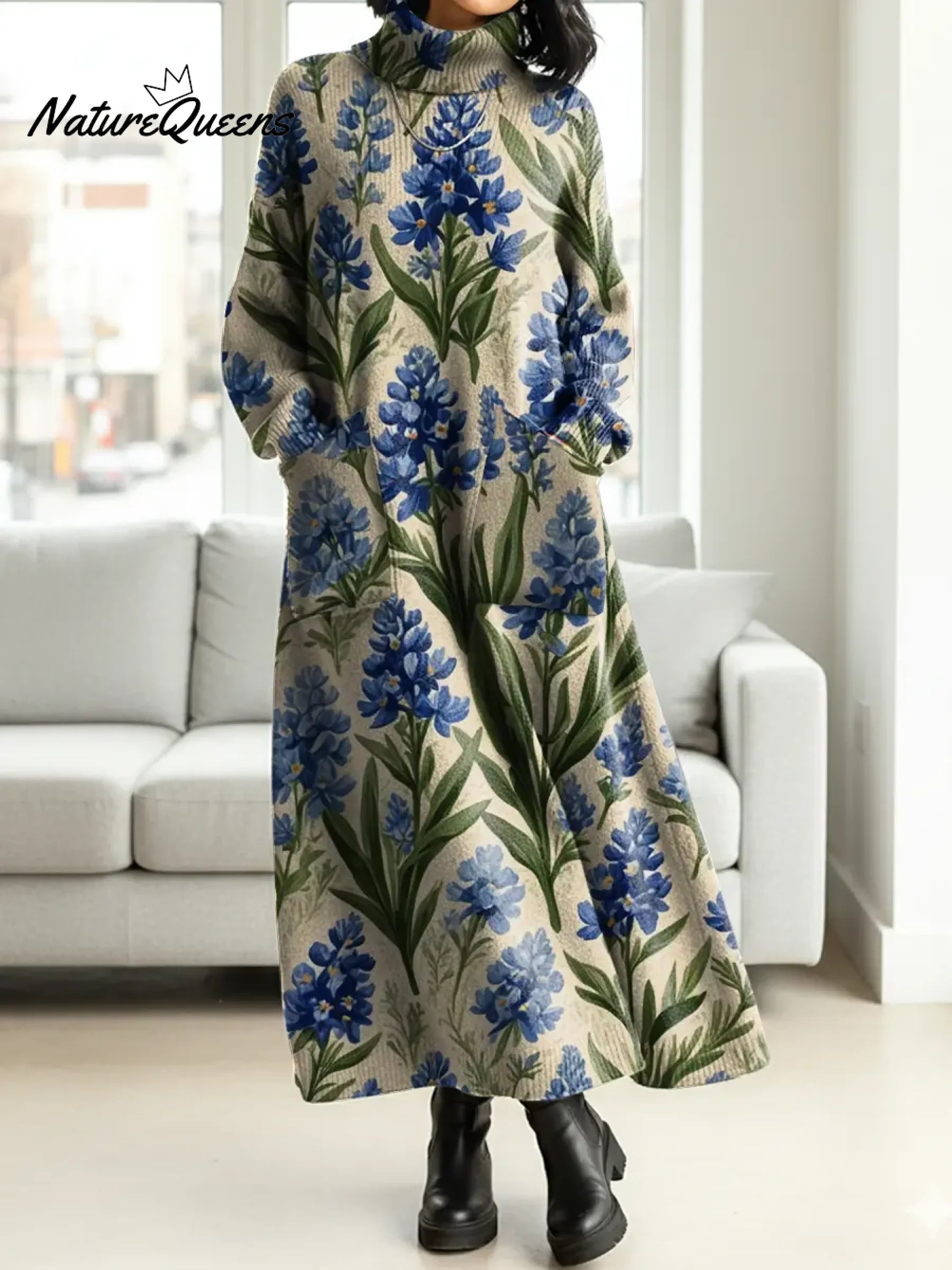 Women's Lavender Floral Art Print Casual Cotton Knitted Dress