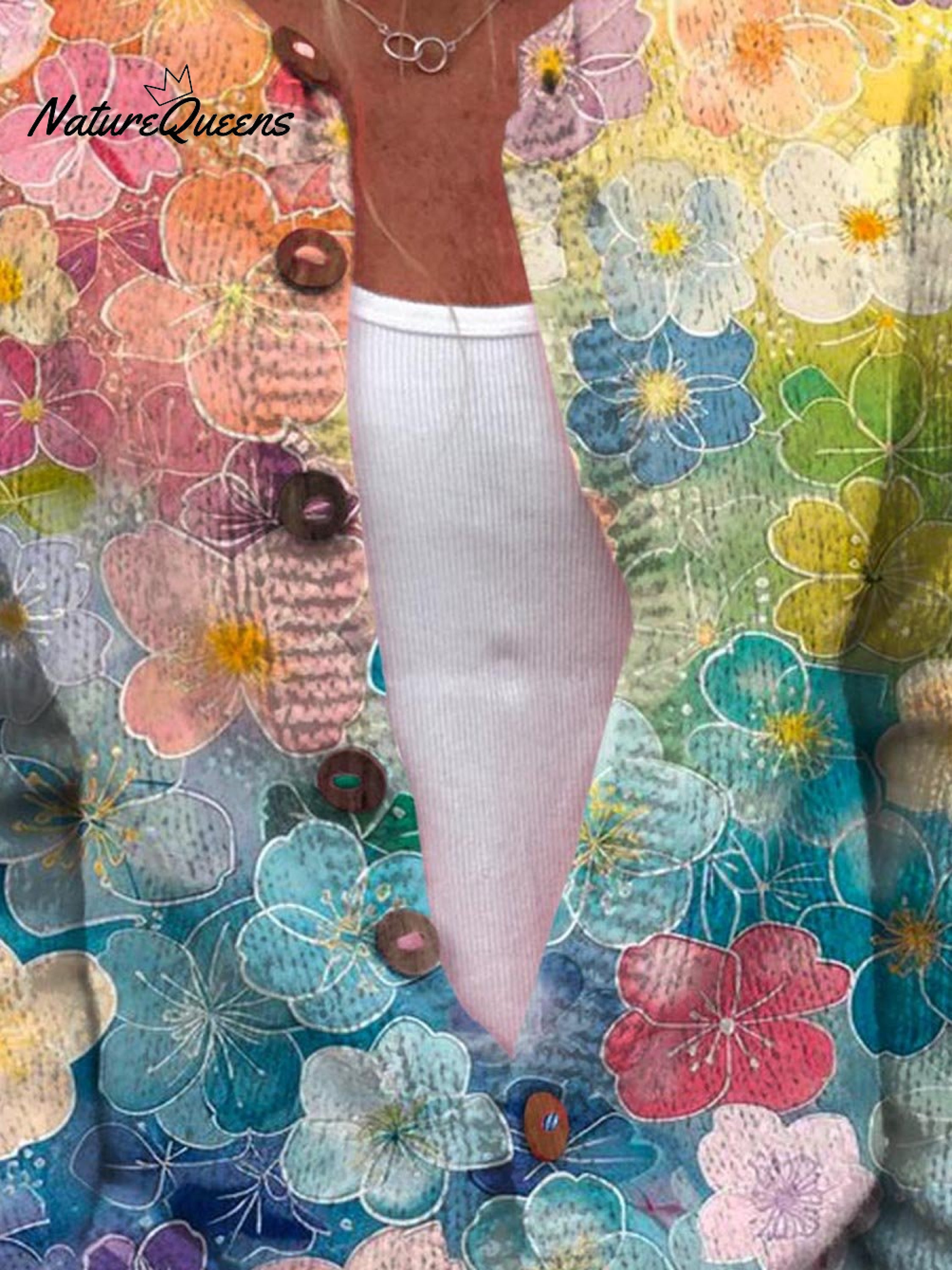 Women's Lovely Floral Art Print Buttoned Cardigan Sweater
