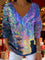 Women's Neon Lights Christmas Tree Cat Aurora Pattern Art Print V-neck Solid Color Loose Shiny Sweater