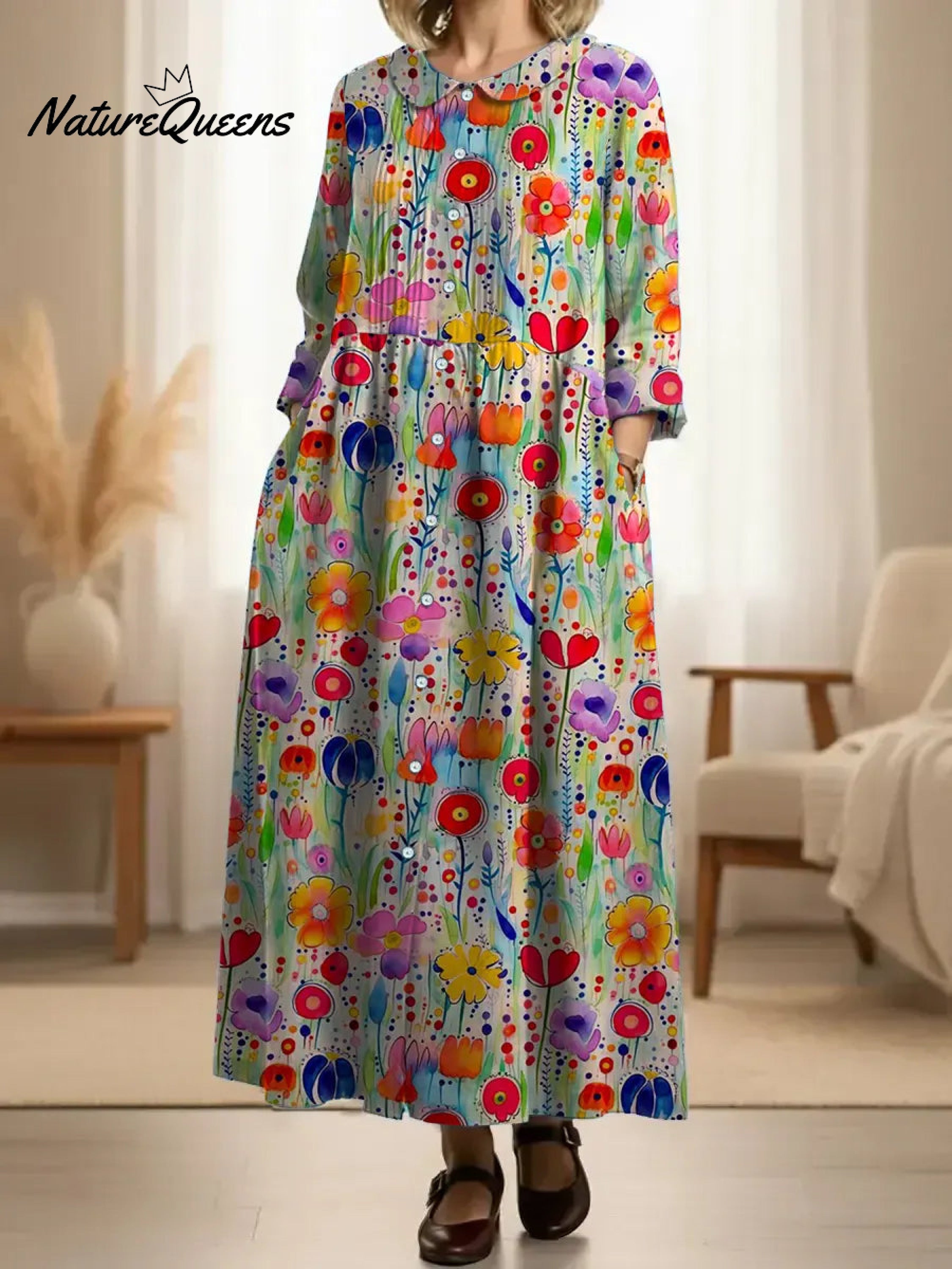 Women's Pleated Retro Floral Patterns Print Doll Collar Casual Long-sleeved Dress