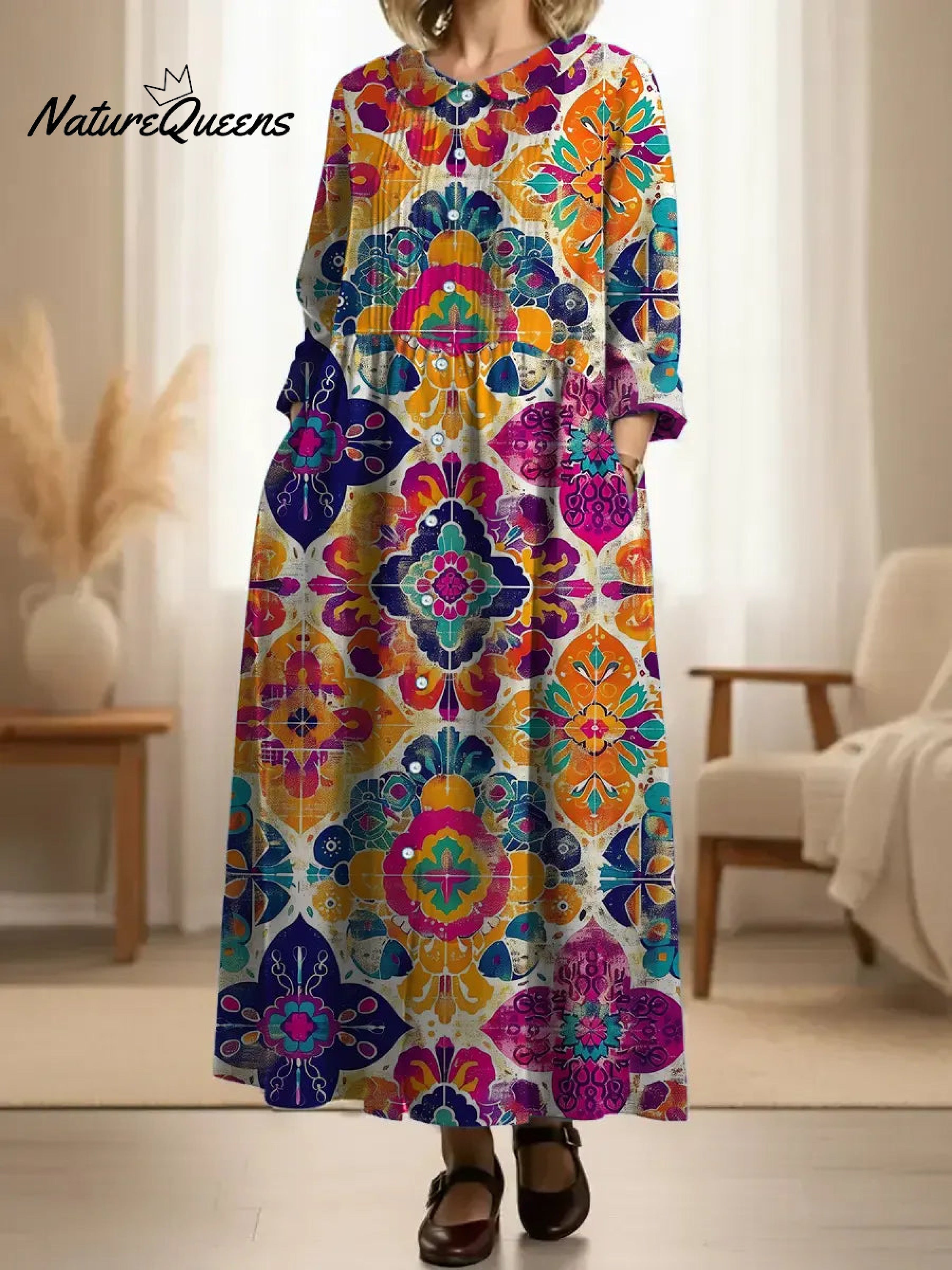 Women's Pleated Retro Geometric Floral Patterns Print Doll Collar Casual Long-sleeved Dress