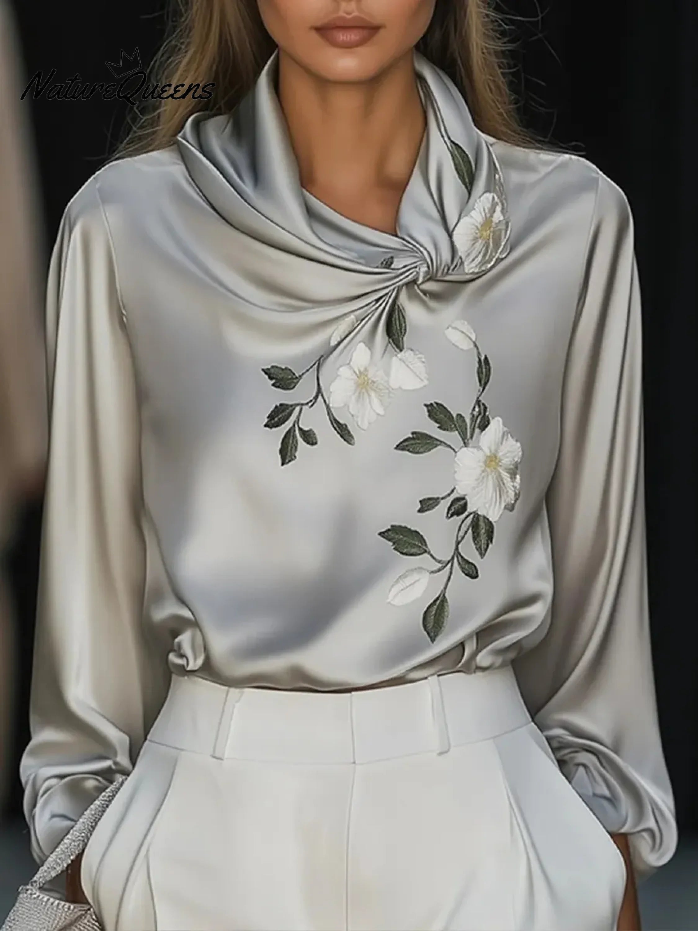Women's Printed Stand-collar Long-sleeved Casual Loose Satin Top
