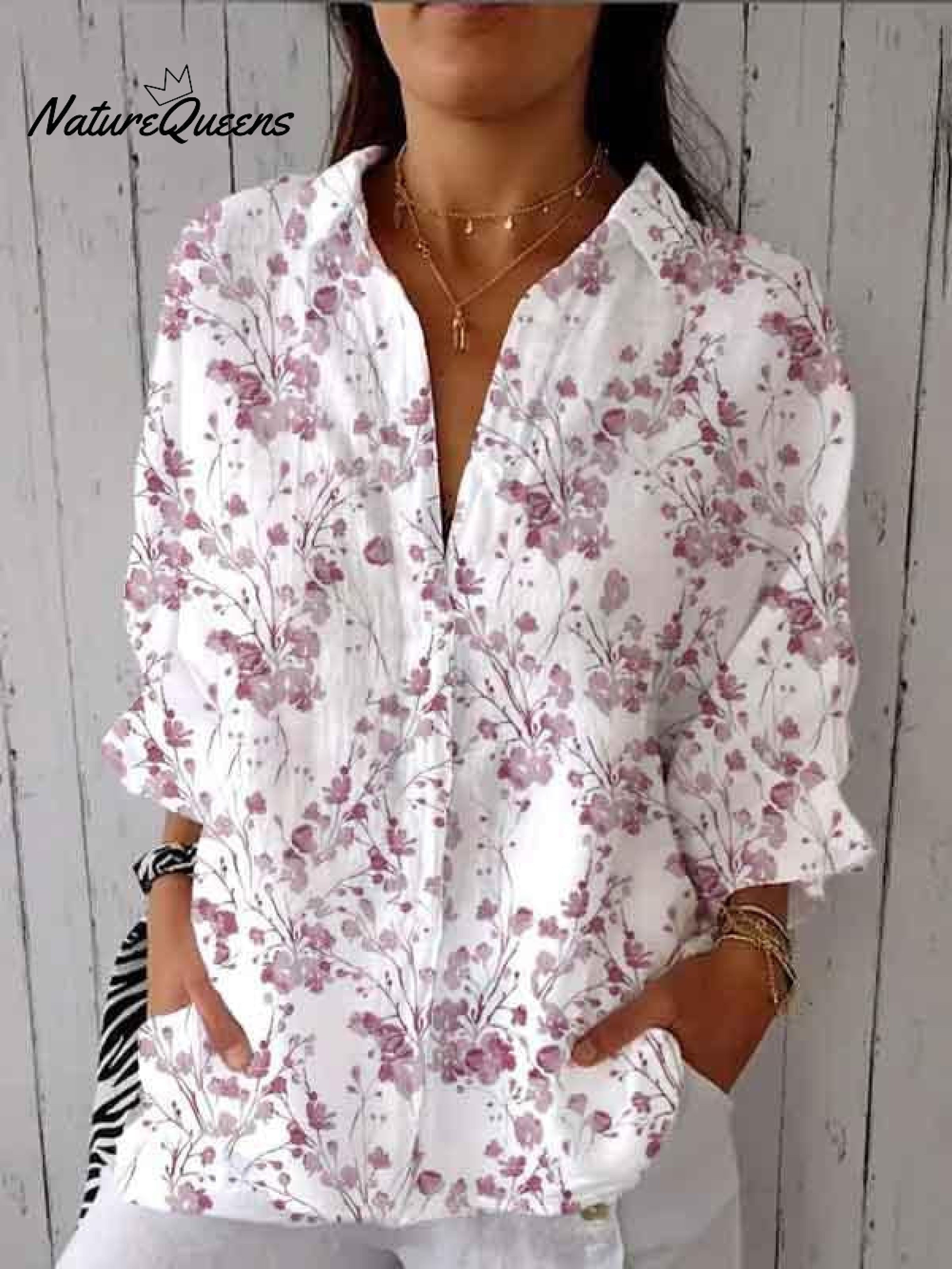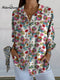 Women's Purple Watercolor Small Floral Print Casual Linen V-neck Shirt