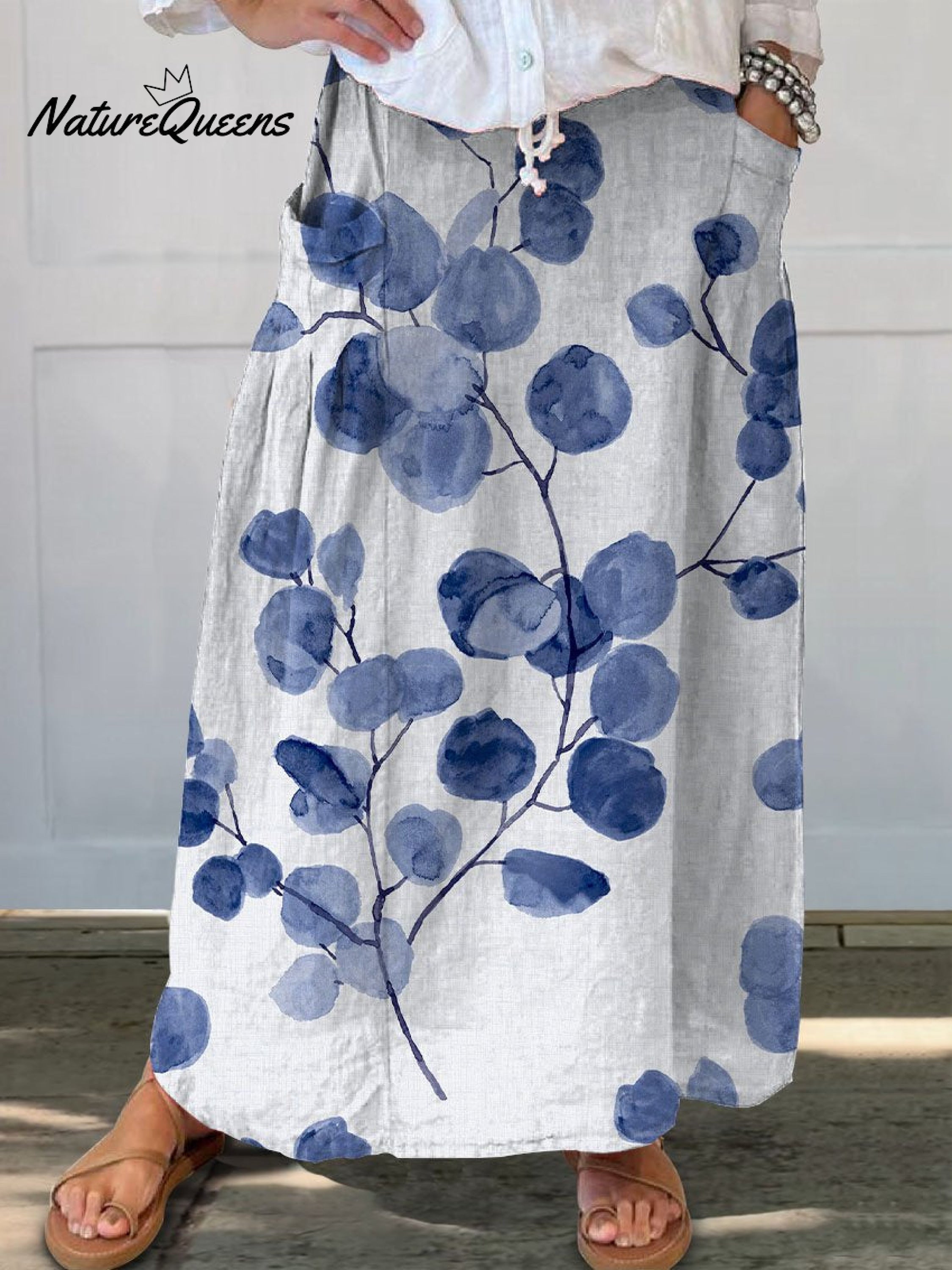 Women's Retro Botanical Floral Linen Elastic waistband Pocket Skirt