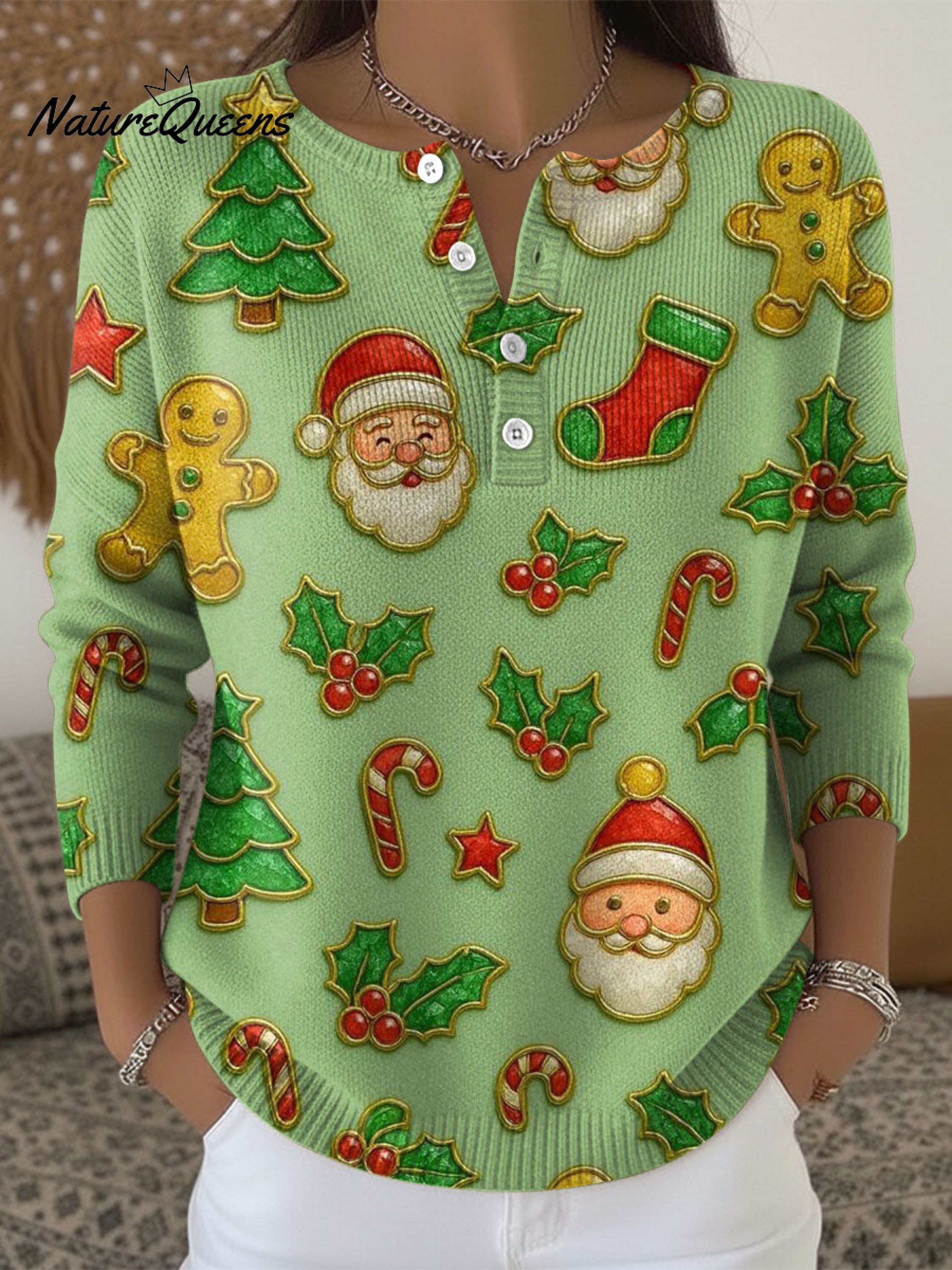 Women's Retro Christmas Tree Santa Claus Gingerbread Man Snowflake Art Pattern Art Print Buttoned Cardigan Sweater