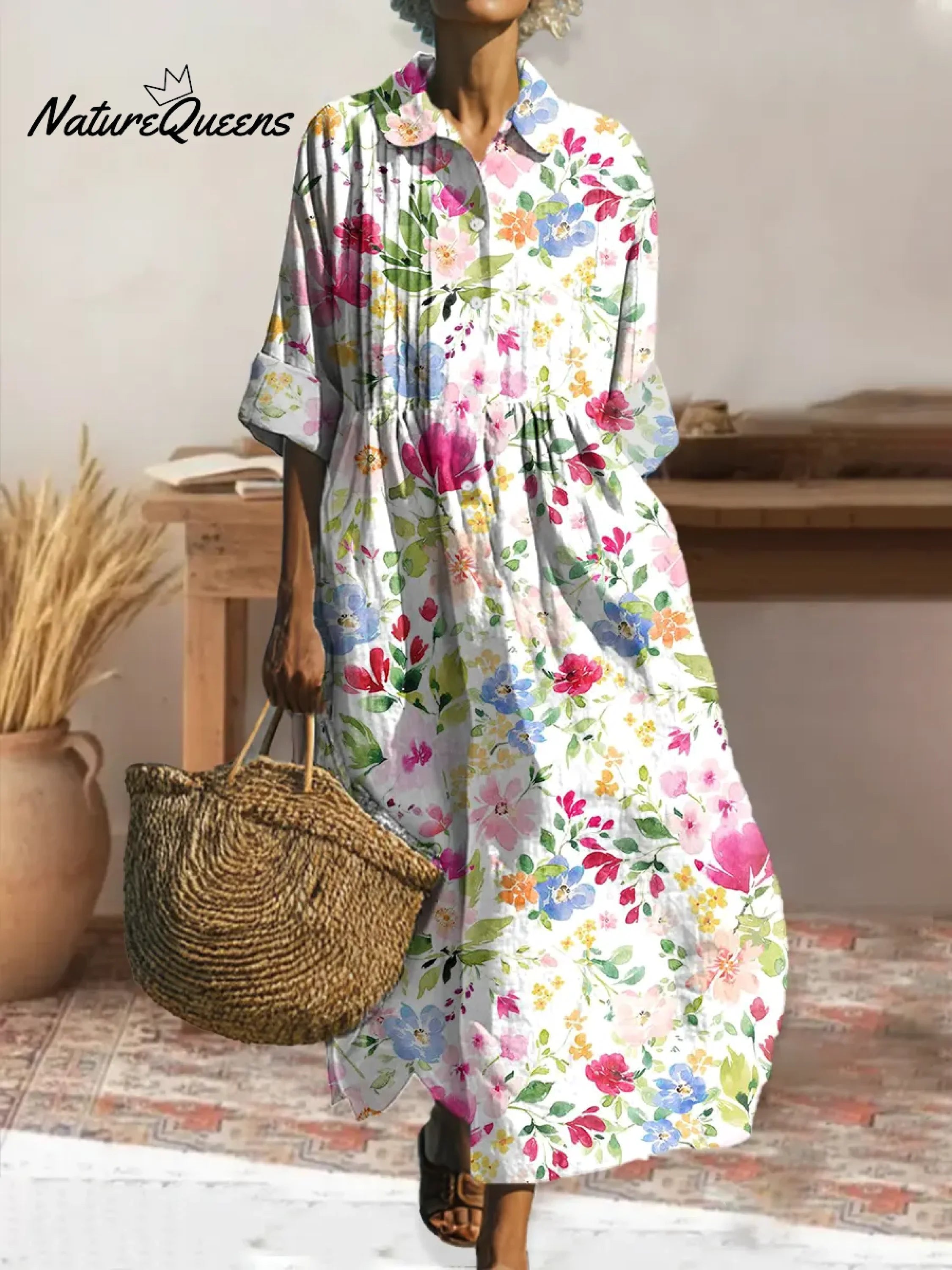 Women's Retro Floral Art Print Pleated Peter Pan Collar Casual Dress