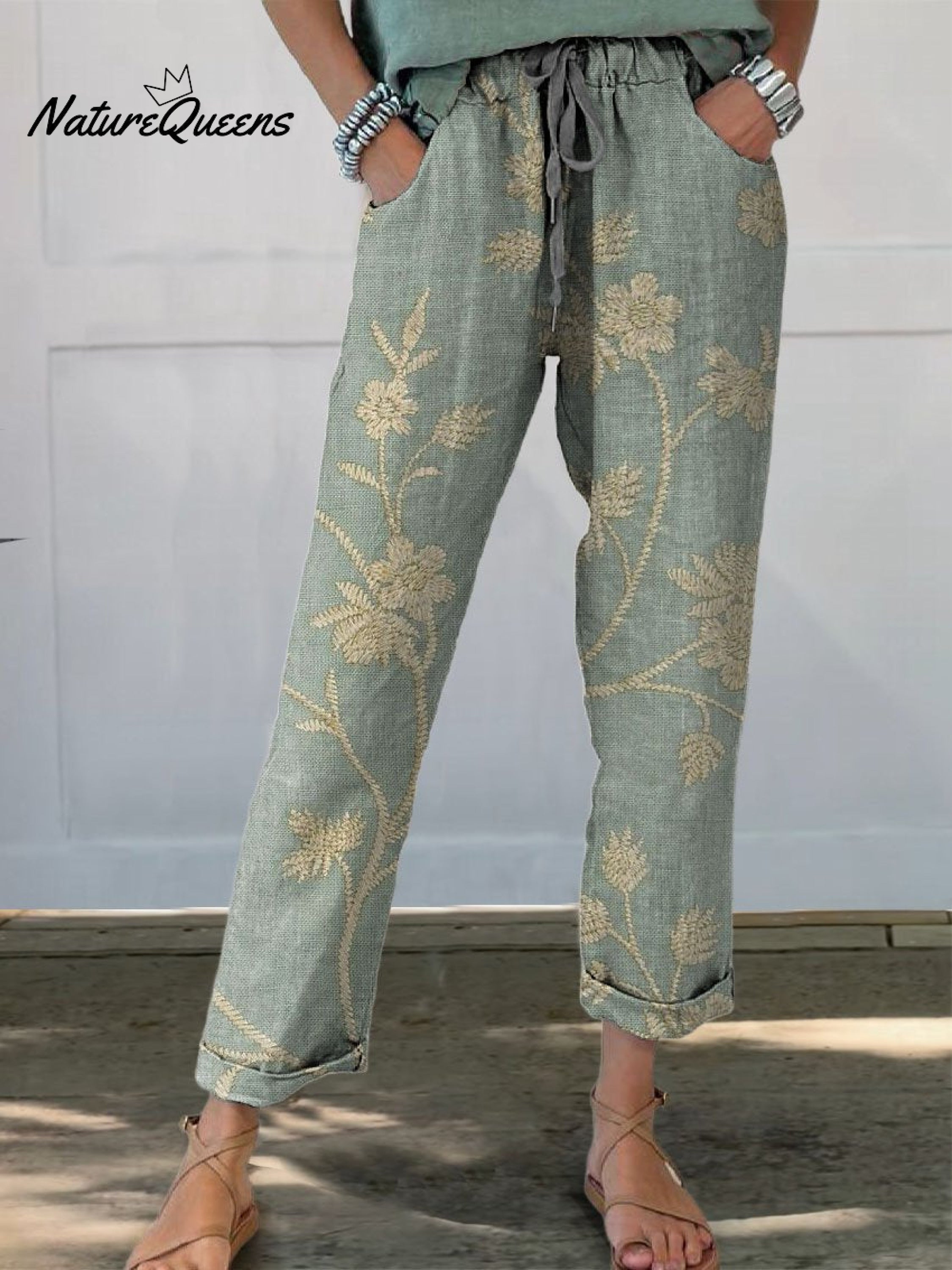 Women's Retro Floral Elegant Art Printed Cotton And Linen Casual Pants