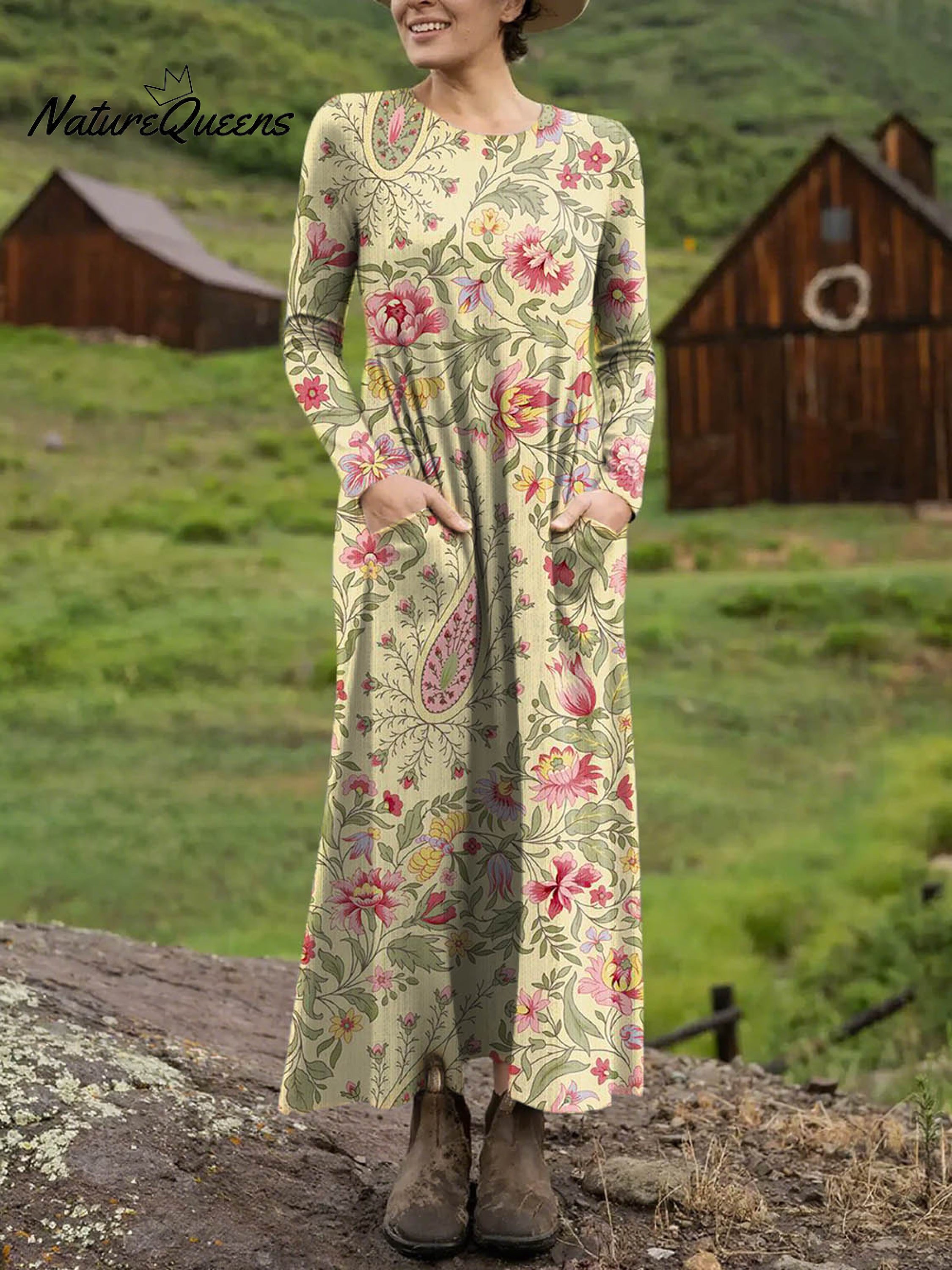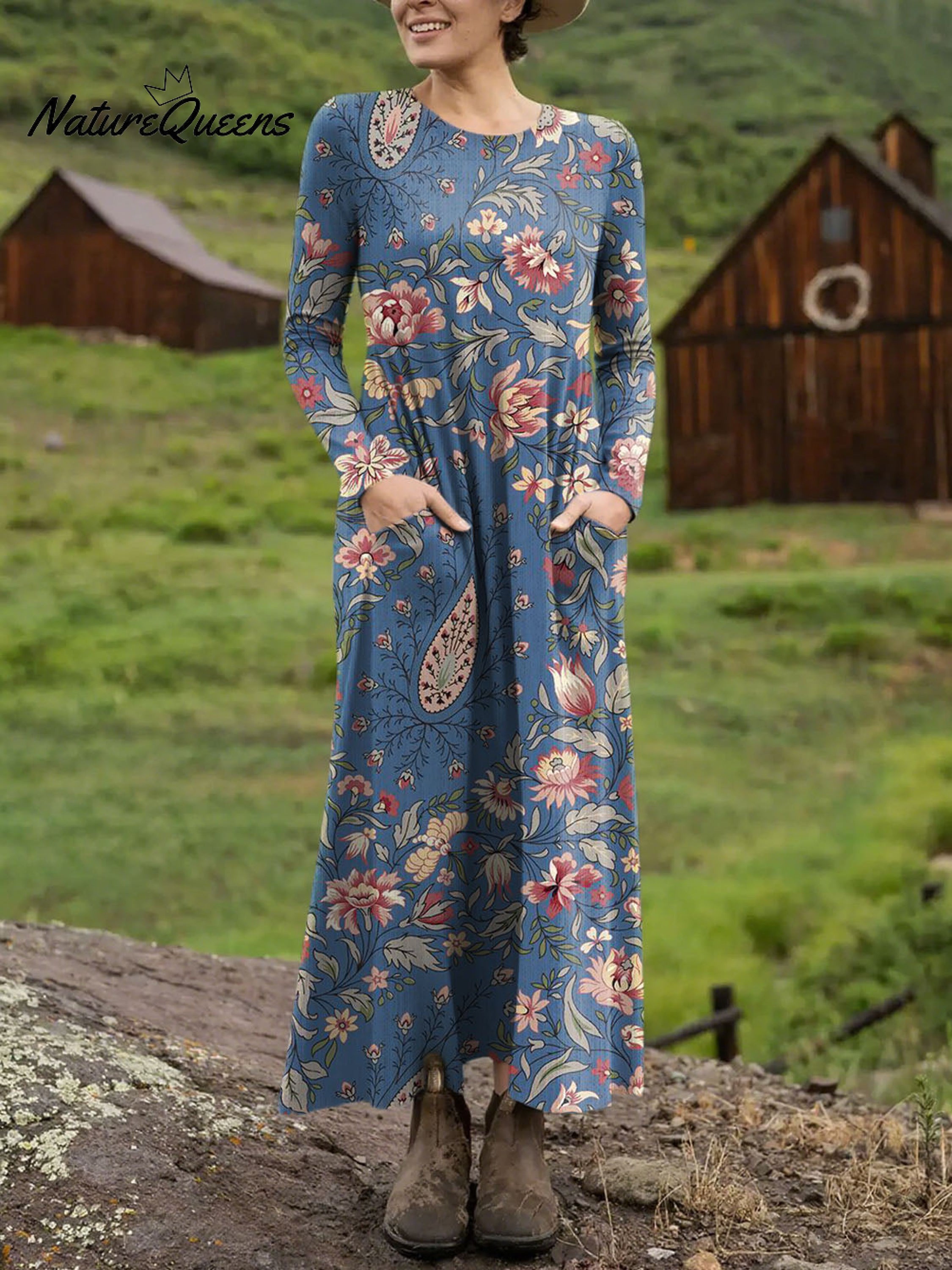 Women's Retro Floral Pattern Art Print Long-sleeved Dress