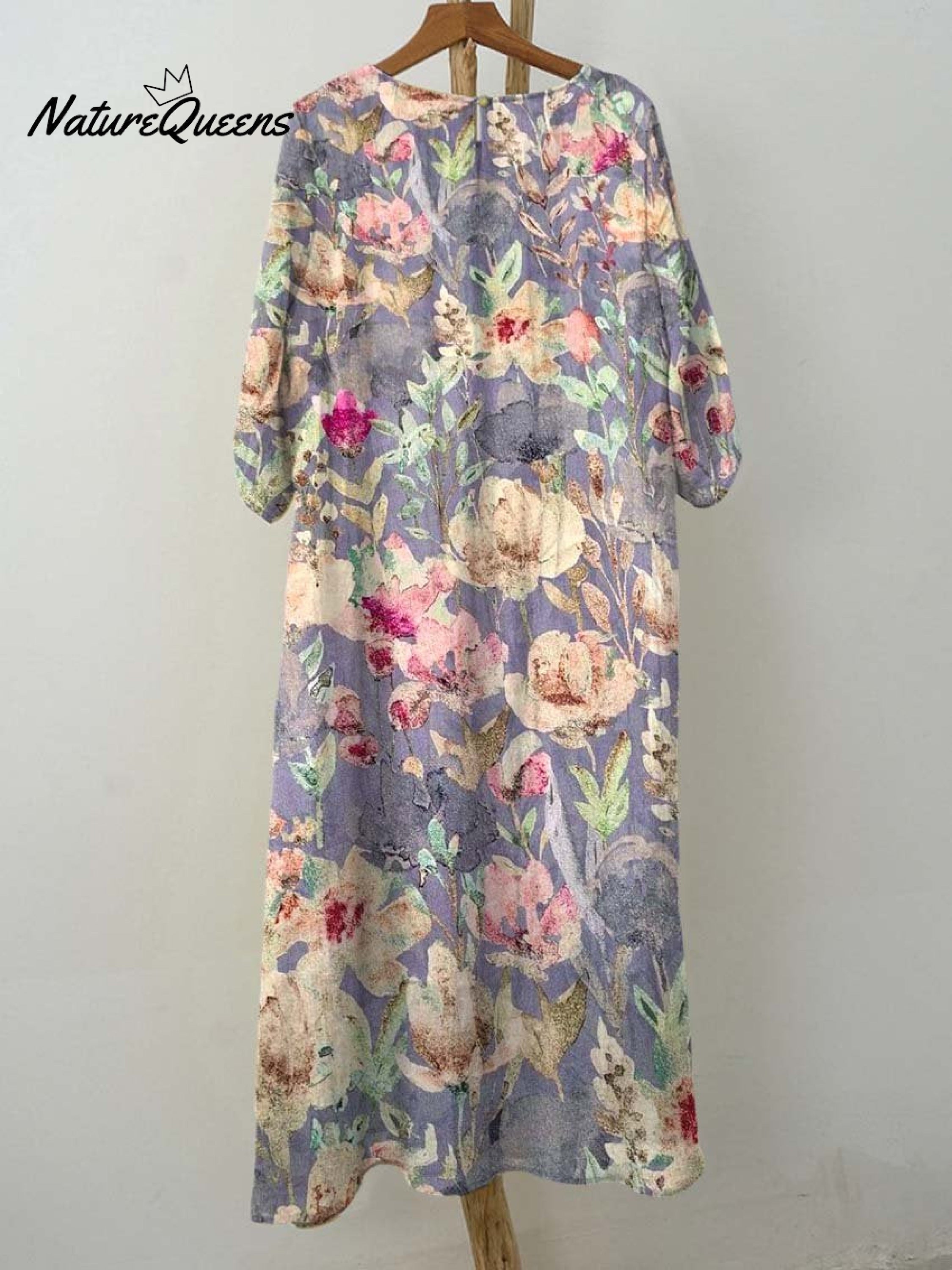 Women's Retro Purple Floral Print Pocket Cotton Dress
