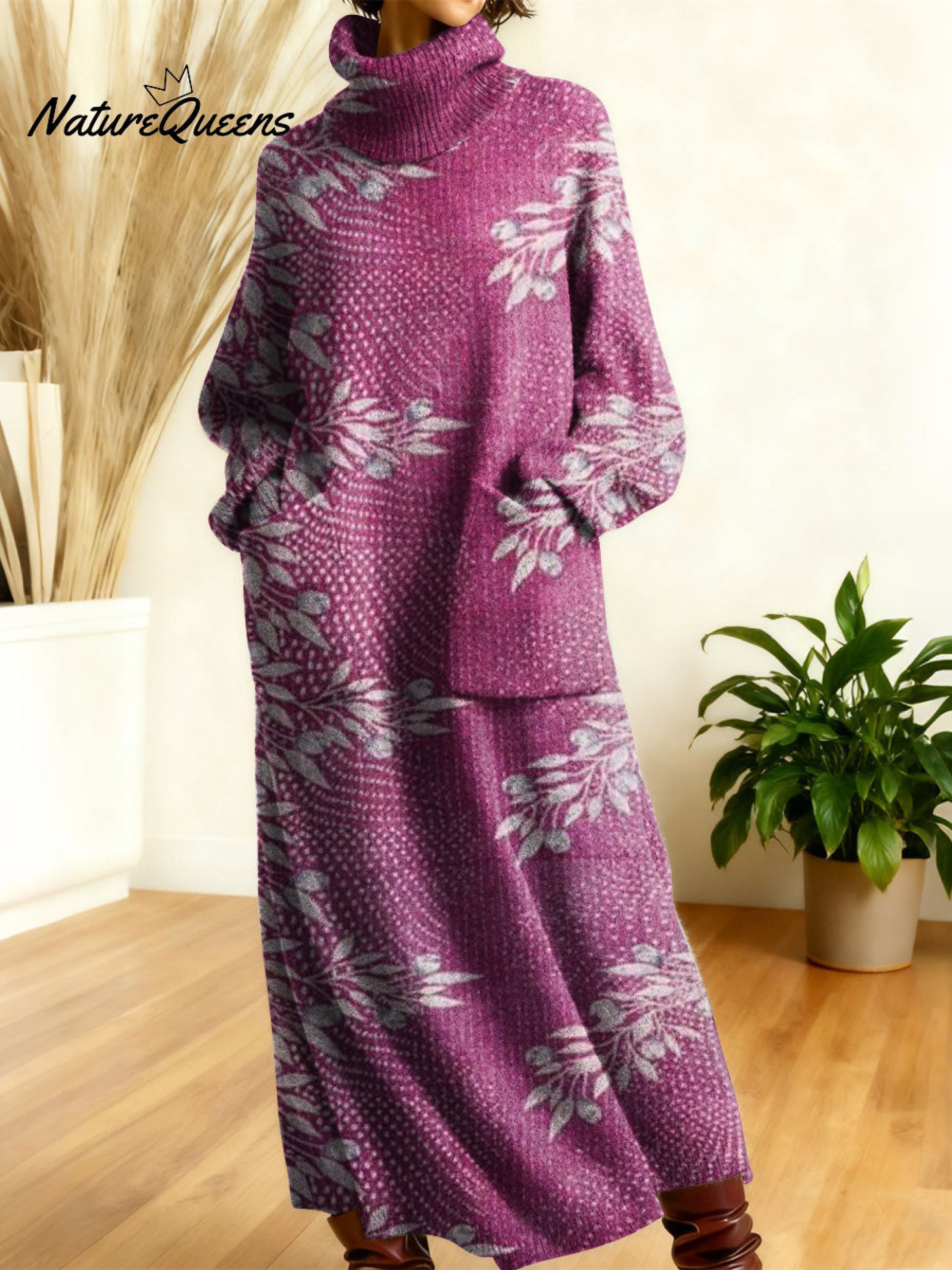 Women's Retro Splicing Colorful Flowers Pattern Art High-neck Long-sleeve Casual Loose Knit Dress