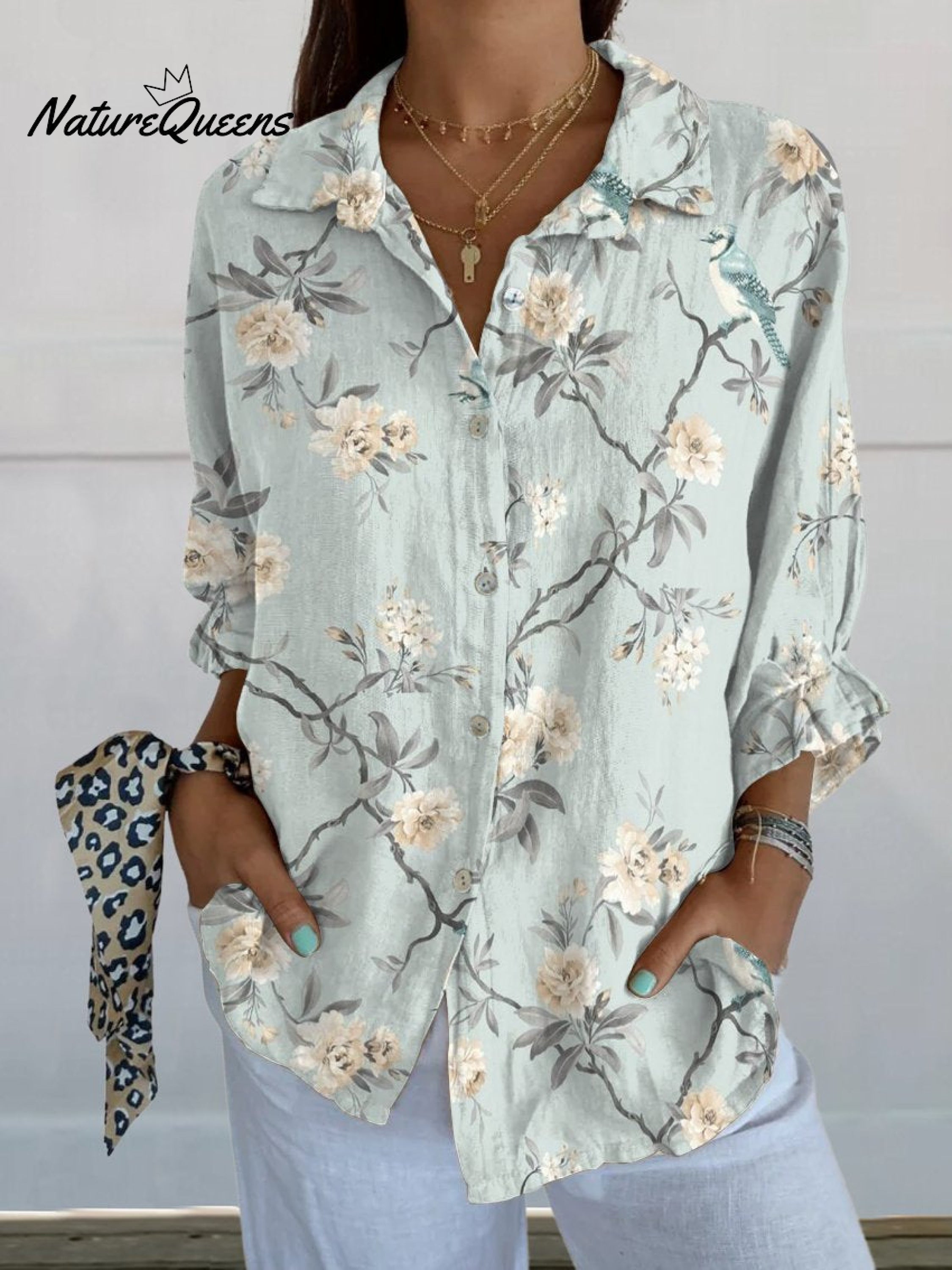 Women's Retro White Floral Print On Light Blue Background Casual Linen V-neck Shirt