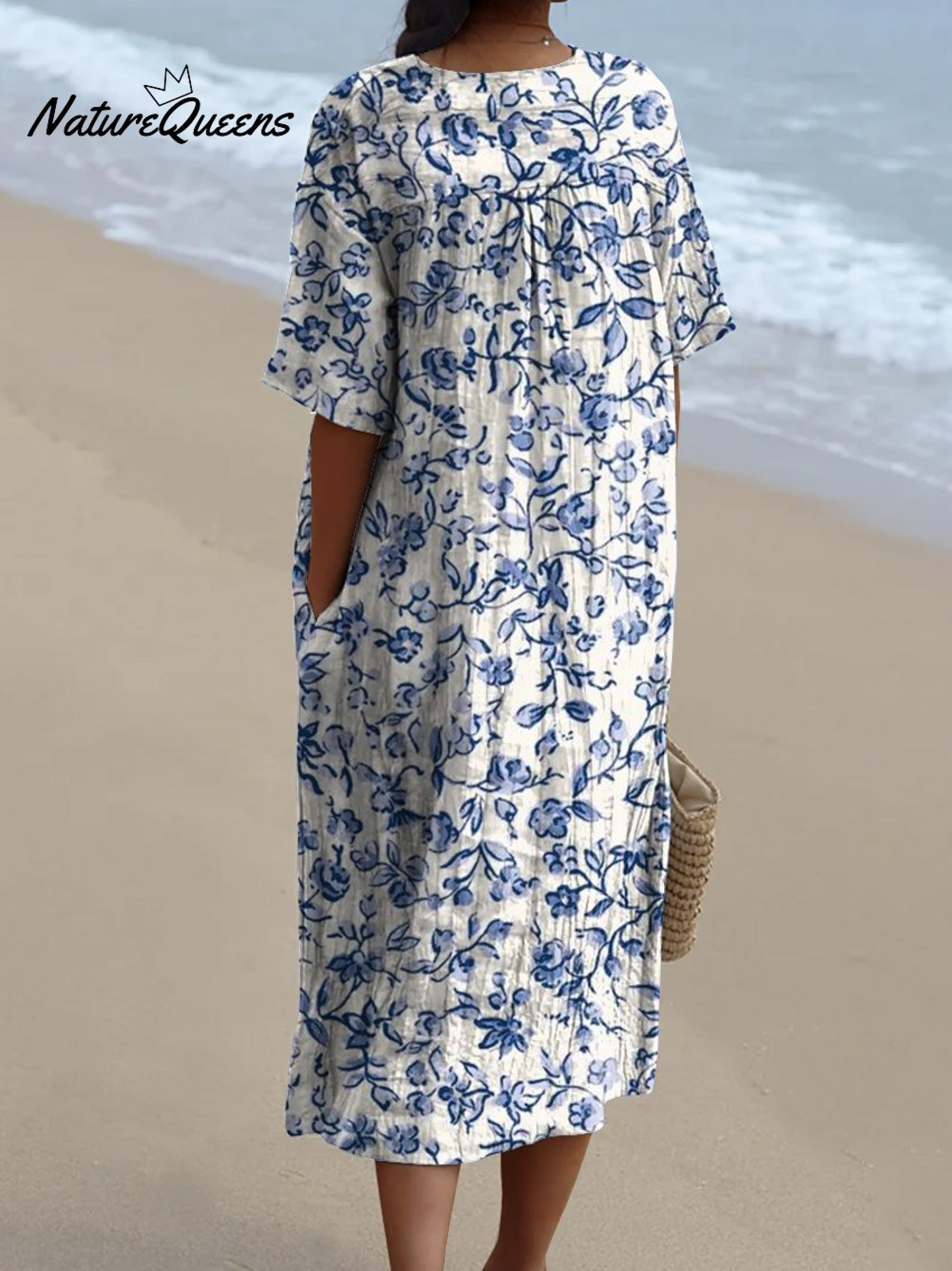 Women's Small Blue Flowers Watercolor Splash Fluid Art Print Flowy Dress