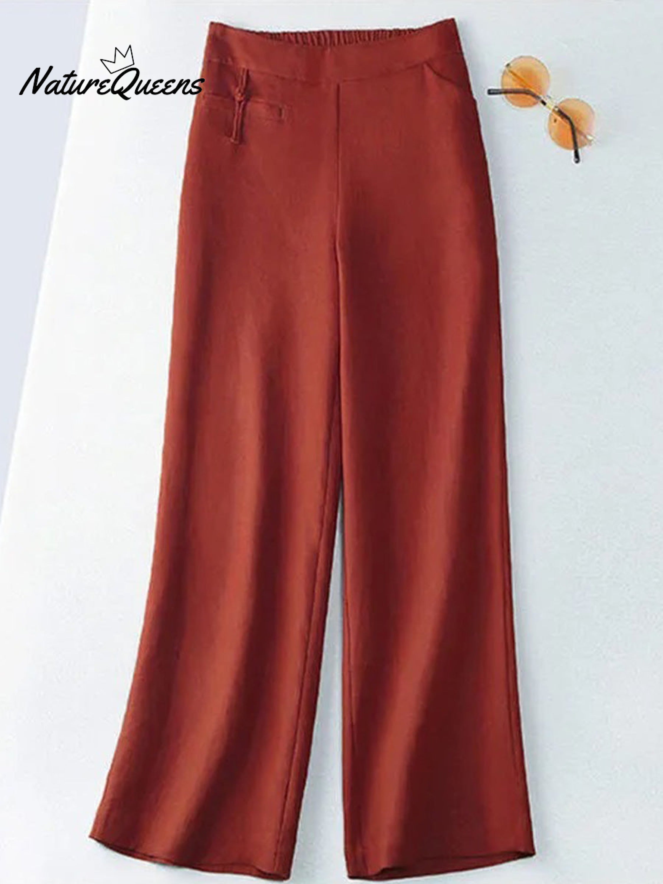 Women's Solid Color Button Half Elastic High Waist Casual Cotton and Linen Wide Leg Pants