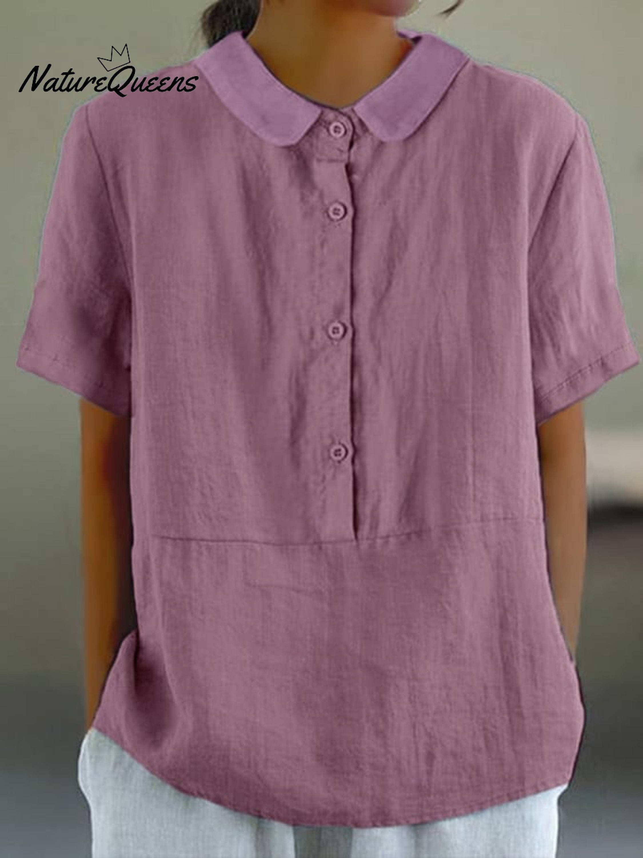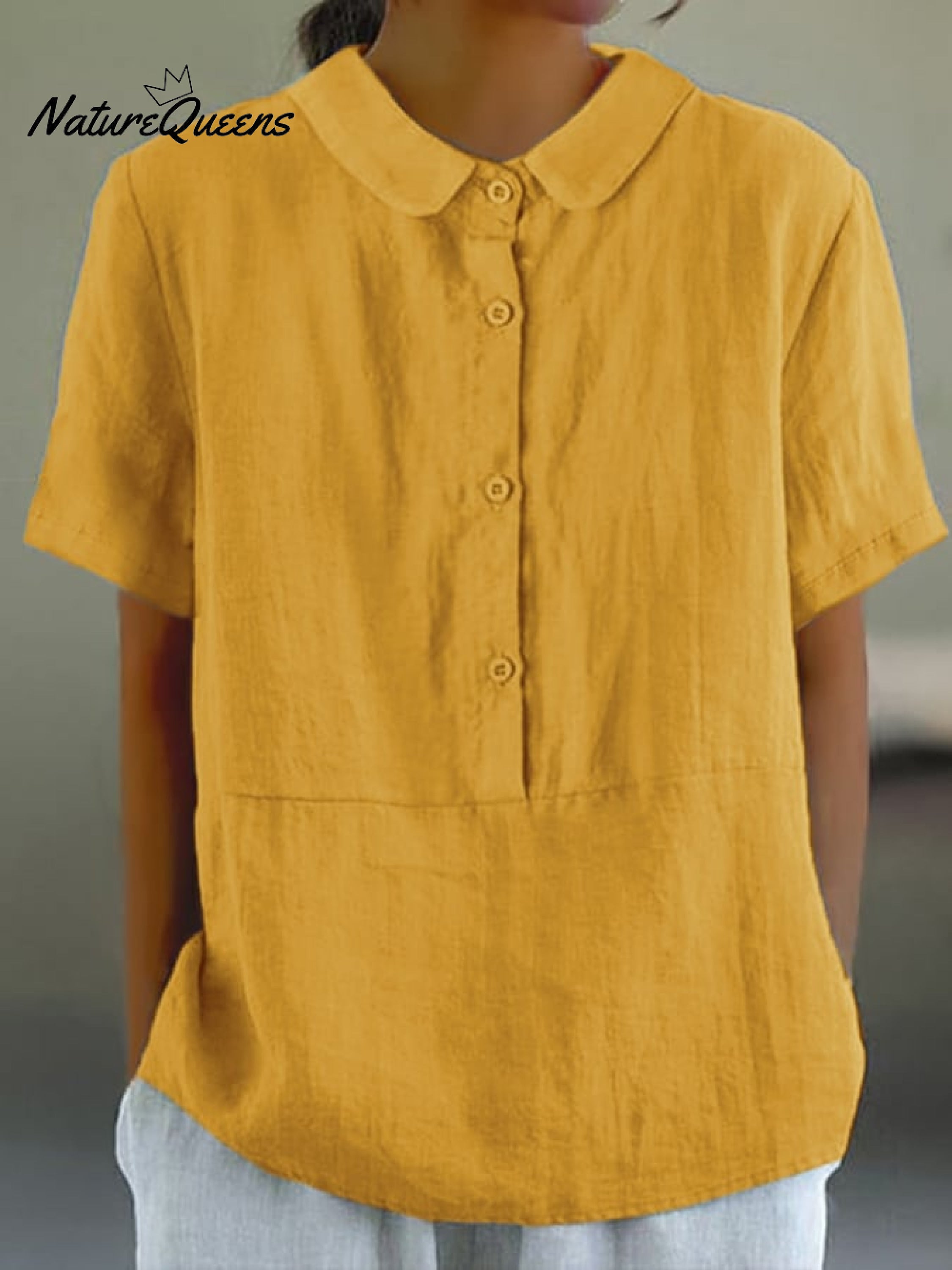 Women's Solid Color Cotton And Linen Lapel Short Sleeved Casual Blouse